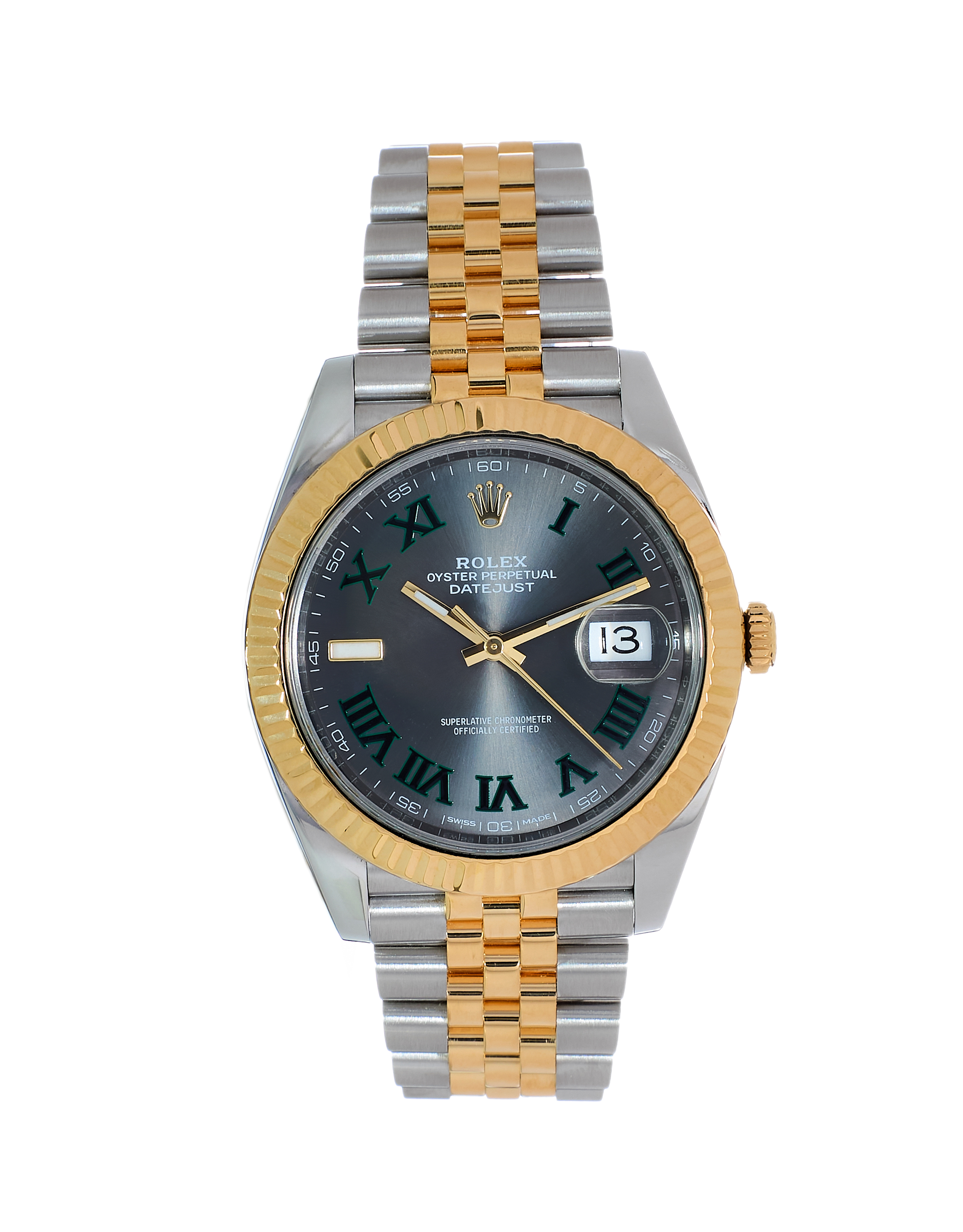 This Rolex Datejust 41 126333 has a slate roman numeral dial and a bracelet strap. This Rolex has undergone a thorough inspection of water resistance, accuracy, functionality and condition to determine the level of reconditioning required to meet our strict standards. It has also been referenced against technical documents and manufacturer records where available to ensure authenticity and a clean history. All our watches have a 24-month warranty for your peace of mind. One of our skilled polishing technicians has removed marks on the case and bracelet of this watch, brought about by daily wear and tear, which is why this watch does not come with the remaining manufacturer’s warranty.