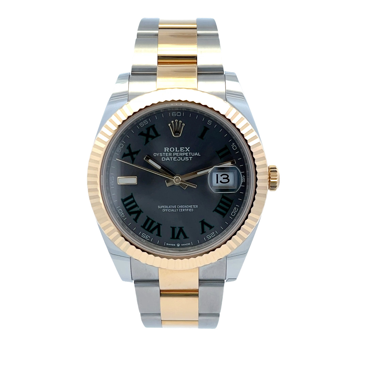 This Rolex Datejust 41 126333 has a slate roman numeral dial and a bracelet strap. This Rolex has undergone a thorough inspection of water resistance, accuracy, functionality and condition to determine the level of reconditioning required to meet our strict standards. It has also been referenced against technical documents and manufacturer records where available to ensure authenticity and a clean history. Our watches have a 24-month warranty for your peace of mind, in conjunction with any remaining manufacturer’s warranty from new or from service. To maintain the manufacturer’s warranty on this watch, it has not been polished in our service centre.