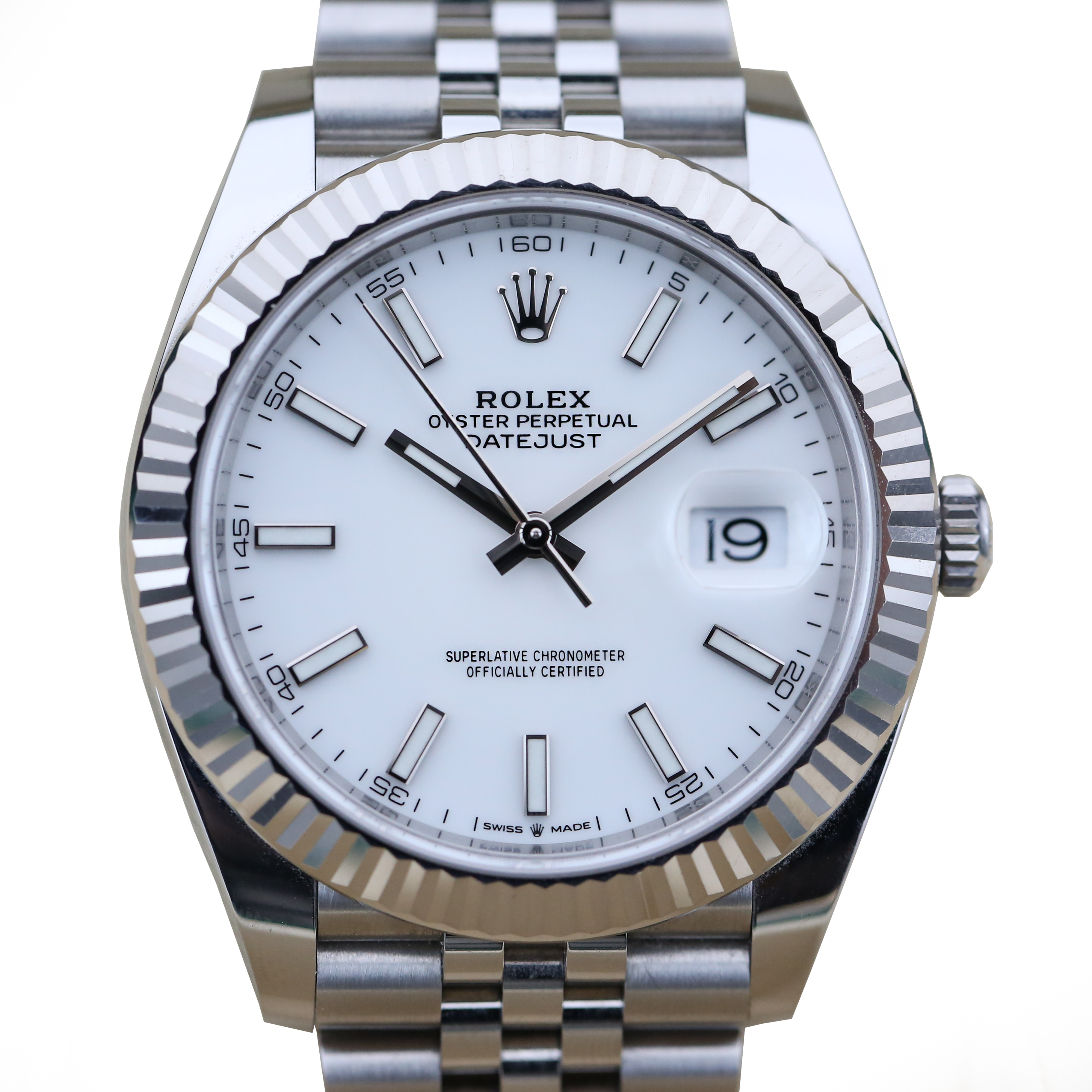 This Rolex Datejust 41 126334 has a white baton dial and a bracelet strap. This Rolex has undergone a thorough inspection of water resistance, accuracy, functionality and condition to determine the level of reconditioning required to meet our strict standards. It has also been referenced against technical documents and manufacturer records where available to ensure authenticity and a clean history. Our watches have a 24-month warranty for your peace of mind, in conjunction with any remaining manufacturer’s warranty from new or from service. To maintain the manufacturer’s warranty on this watch, it has not been polished in our service centre.