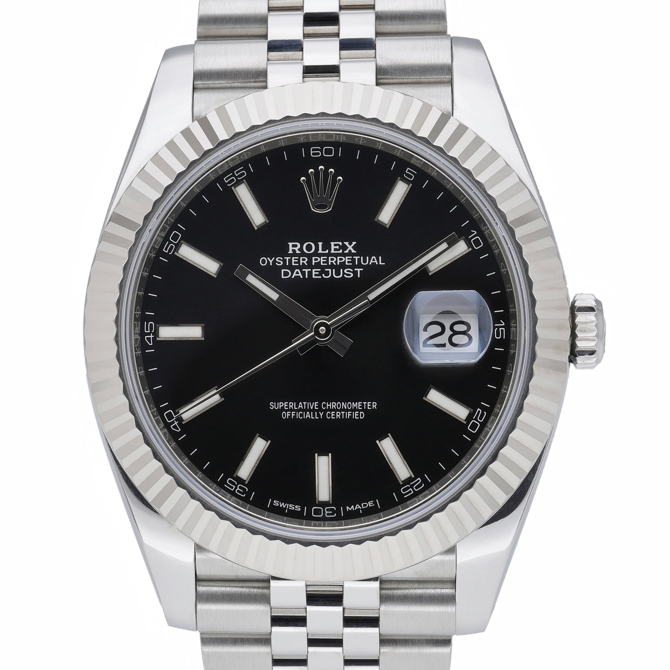 This Rolex Datejust 41 126334 has a black baton dial and a bracelet strap. This Rolex has undergone a thorough inspection of water resistance, accuracy, functionality and condition to determine the level of reconditioning required to meet our strict standards. It has also been referenced against technical documents and manufacturer records where available to ensure authenticity and a clean history. All our watches have a 24-month warranty for your peace of mind. One of our skilled polishing technicians has removed marks on the case and bracelet of this watch, brought about by daily wear and tear, which is why this watch does not come with the remaining manufacturer’s warranty.