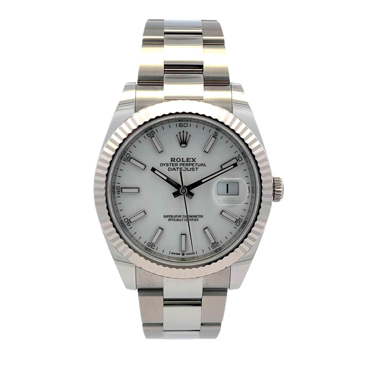 This Rolex Datejust 41 126334 has a white baton dial and a bracelet strap. This Rolex has undergone a thorough inspection of water resistance, accuracy, functionality and condition to determine the level of reconditioning required to meet our strict standards. It has also been referenced against technical documents and manufacturer records where available to ensure authenticity and a clean history. Our watches have a 24-month warranty for your peace of mind, in conjunction with any remaining manufacturer’s warranty from new or from service. To maintain the manufacturer’s warranty on this watch, it has not been polished in our service centre.