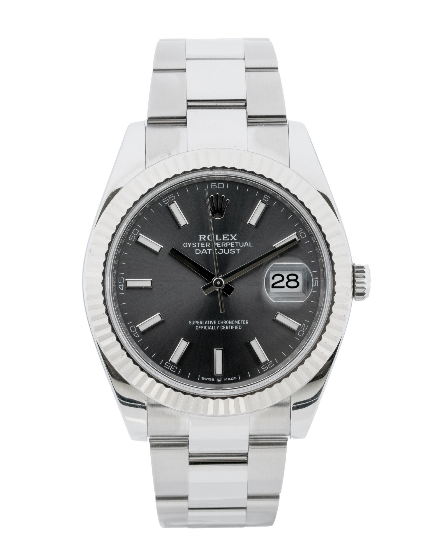 This Rolex Datejust 41 126334 has a rhodium baton dial and a bracelet strap. This Rolex has undergone a thorough inspection of water resistance, accuracy, functionality and condition to determine the level of reconditioning required to meet our strict standards. It has also been referenced against technical documents and manufacturer records where available to ensure authenticity and a clean history. All our watches have a 24-month warranty for your peace of mind. One of our skilled polishing technicians has removed marks on the case and bracelet of this watch, brought about by daily wear and tear, which is why this watch does not come with the remaining manufacturer’s warranty.
