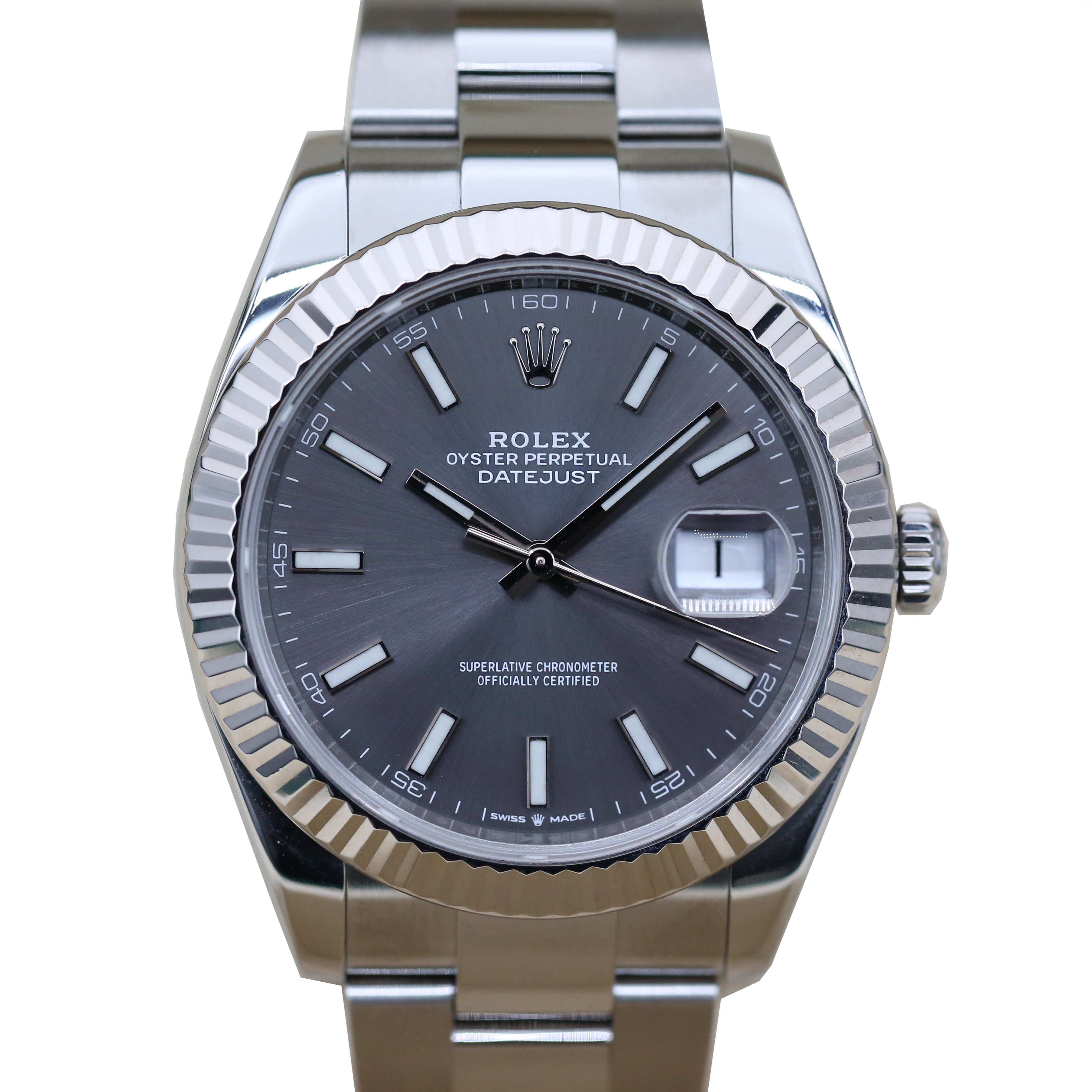 This Rolex Datejust 41 126334 has a rhodium baton dial and a bracelet strap. This Rolex has undergone a thorough inspection of water resistance, accuracy, functionality and condition to determine the level of reconditioning required to meet our strict standards. It has also been referenced against technical documents and manufacturer records where available to ensure authenticity and a clean history. All our watches have a 24-month warranty for your peace of mind. One of our skilled polishing technicians has removed marks on the case and bracelet of this watch, brought about by daily wear and tear, which is why this watch does not come with the remaining manufacturer’s warranty.