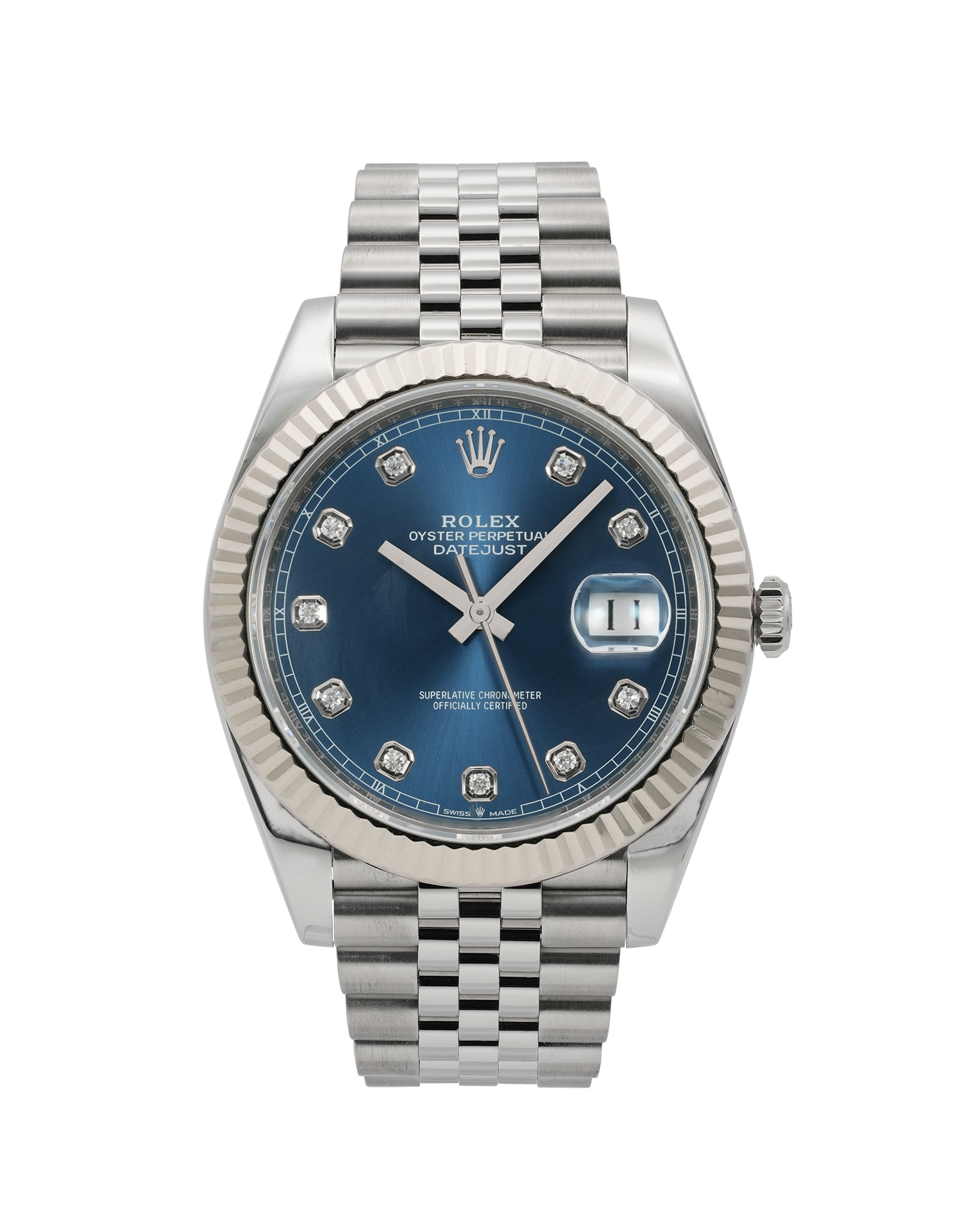 This Rolex Datejust 41 126334 has a blue diamond dial and a bracelet strap. This Rolex has undergone a thorough inspection of water resistance, accuracy, functionality and condition to determine the level of reconditioning required to meet our strict standards. It has also been referenced against technical documents and manufacturer records where available to ensure authenticity and a clean history. All our watches have a 24-month warranty for your peace of mind. One of our skilled polishing technicians has removed marks on the case and bracelet of this watch, brought about by daily wear and tear, which is why this watch does not come with the remaining manufacturer’s warranty.