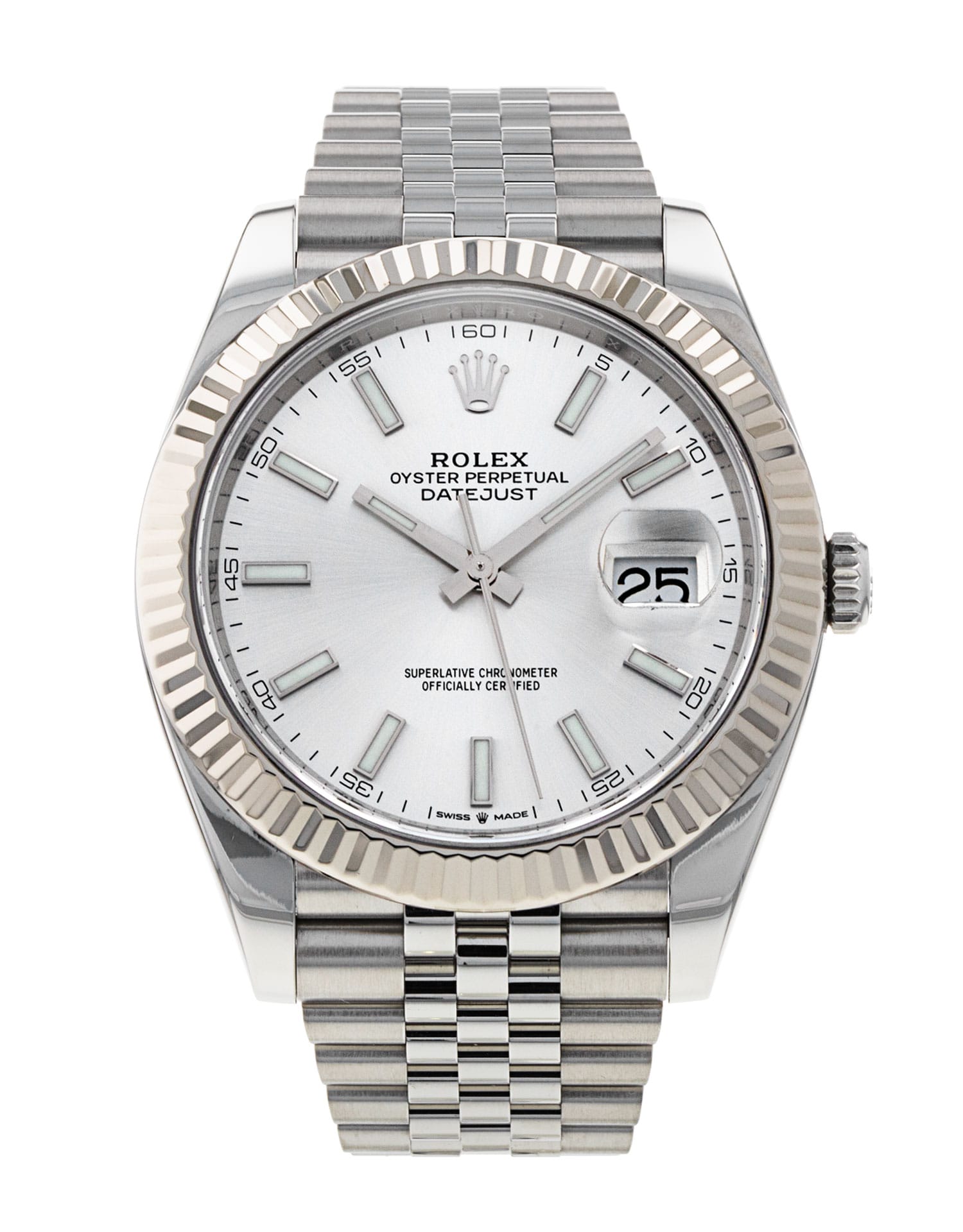 This Rolex Datejust 41 126334 has a silver baton dial and a bracelet strap. This Rolex has undergone a thorough inspection of water resistance, accuracy, functionality and condition to determine the level of reconditioning required to meet our strict standards. It has also been referenced against technical documents and manufacturer records where available to ensure authenticity and a clean history. All our watches have a 24-month warranty for your peace of mind. One of our skilled polishing technicians has removed marks on the case and bracelet of this watch, brought about by daily wear and tear, which is why this watch does not come with the remaining manufacturer’s warranty.