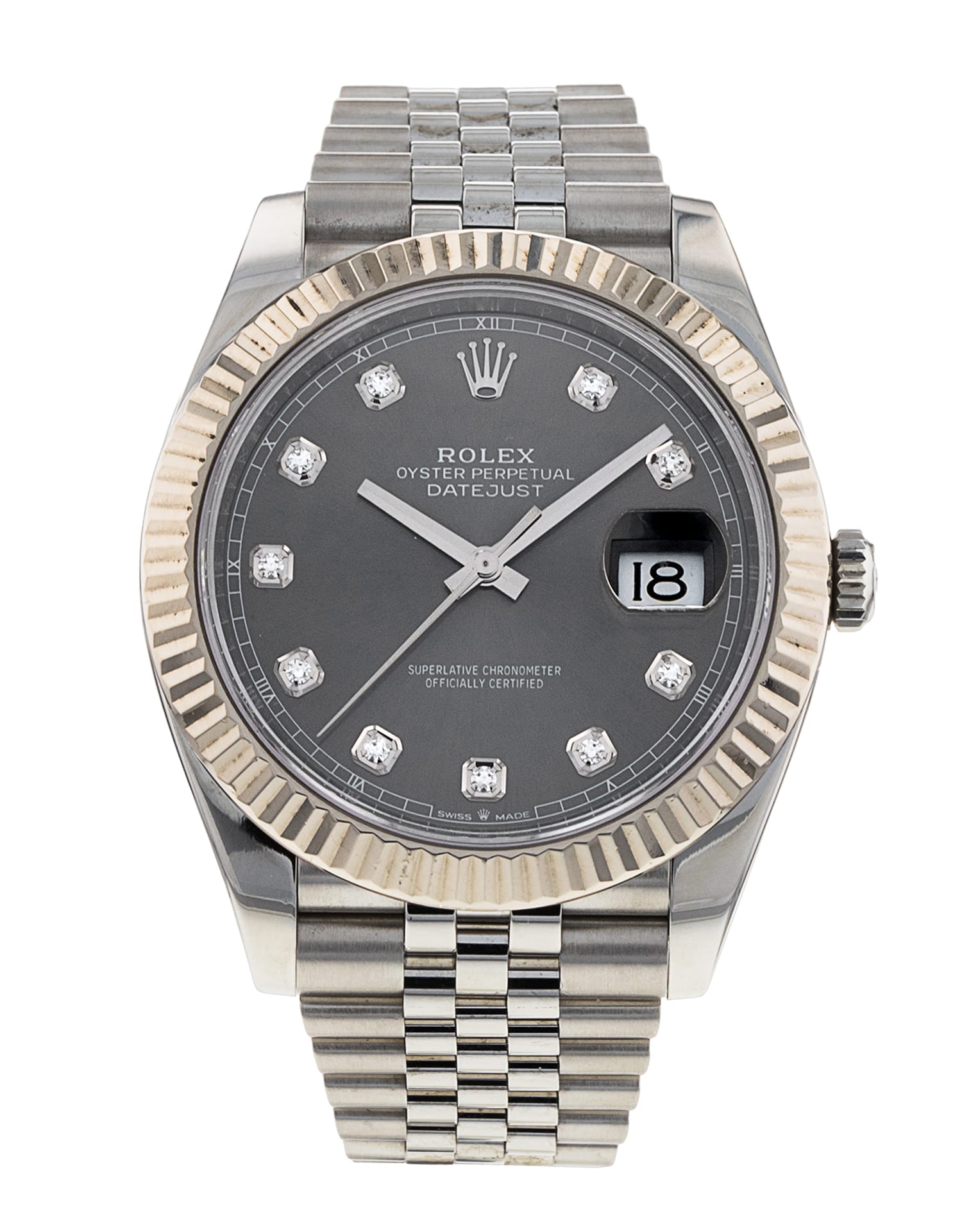 This Rolex Datejust 41 126334 has a slate diamond dial and a bracelet strap. This Rolex has undergone a thorough inspection of water resistance, accuracy, functionality and condition to determine the level of reconditioning required to meet our strict standards. It has also been referenced against technical documents and manufacturer records where available to ensure authenticity and a clean history. All our watches have a 24-month warranty for your peace of mind. One of our skilled polishing technicians has removed marks on the case and bracelet of this watch, brought about by daily wear and tear, which is why this watch does not come with the remaining manufacturer’s warranty.