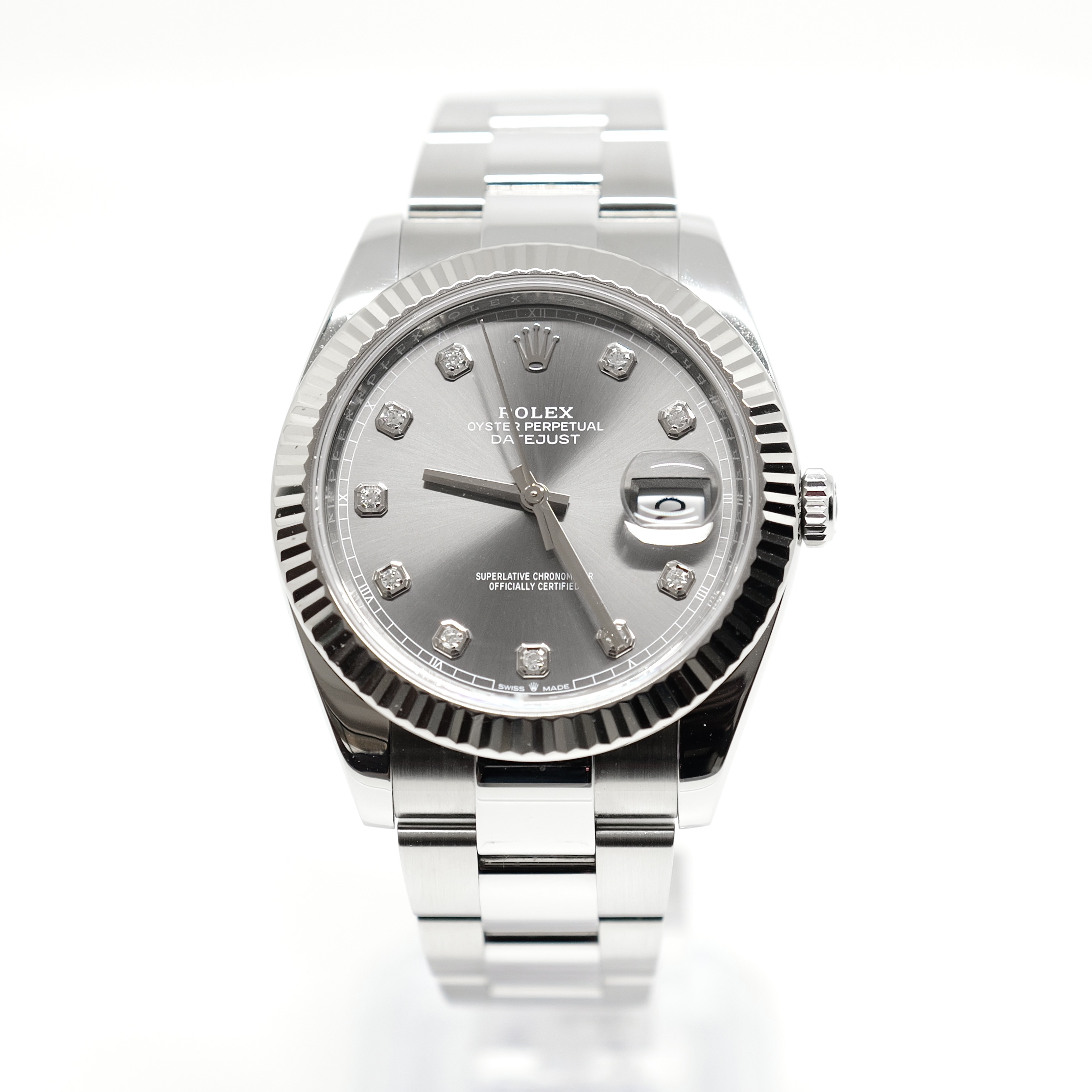 This Rolex Datejust 41 126334 has a slate diamond dial and a bracelet strap. This Rolex has undergone a thorough inspection of water resistance, accuracy, functionality and condition to determine the level of reconditioning required to meet our strict standards. It has also been referenced against technical documents and manufacturer records where available to ensure authenticity and a clean history. Our watches have a 24-month warranty for your peace of mind, in conjunction with any remaining manufacturer’s warranty from new or from service. To maintain the manufacturer’s warranty on this watch, it has not been polished in our service centre.