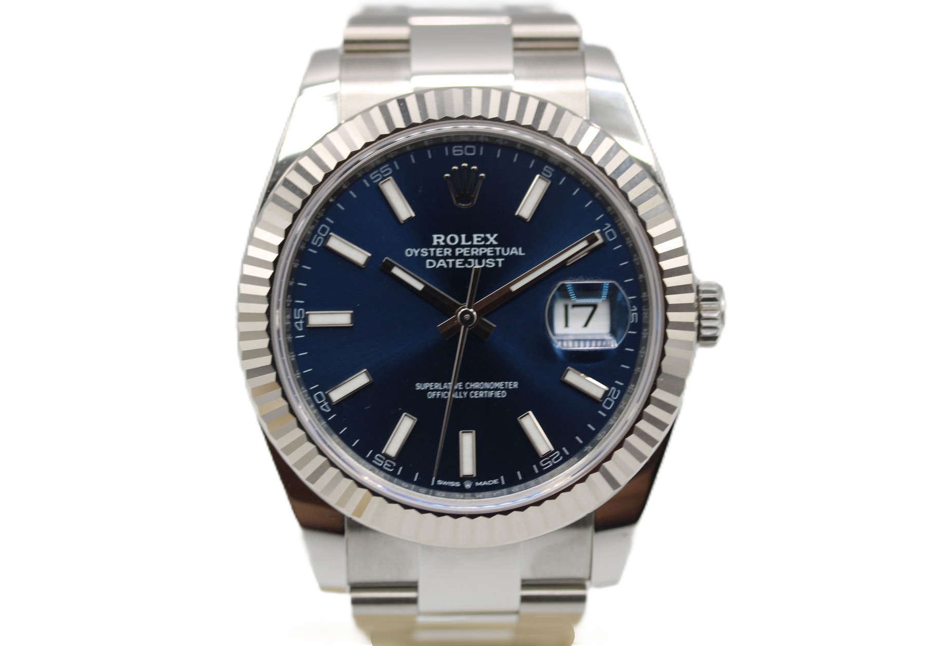 This Rolex Datejust 41 126334 has a blue baton dial and a bracelet strap. This Rolex has undergone a thorough inspection of water resistance, accuracy, functionality and condition to determine the level of reconditioning required to meet our strict standards. It has also been referenced against technical documents and manufacturer records where available to ensure authenticity and a clean history. Our watches have a 24-month warranty for your peace of mind, in conjunction with any remaining manufacturer’s warranty from new or from service. To maintain the manufacturer’s warranty on this watch, it has not been polished in our service centre.