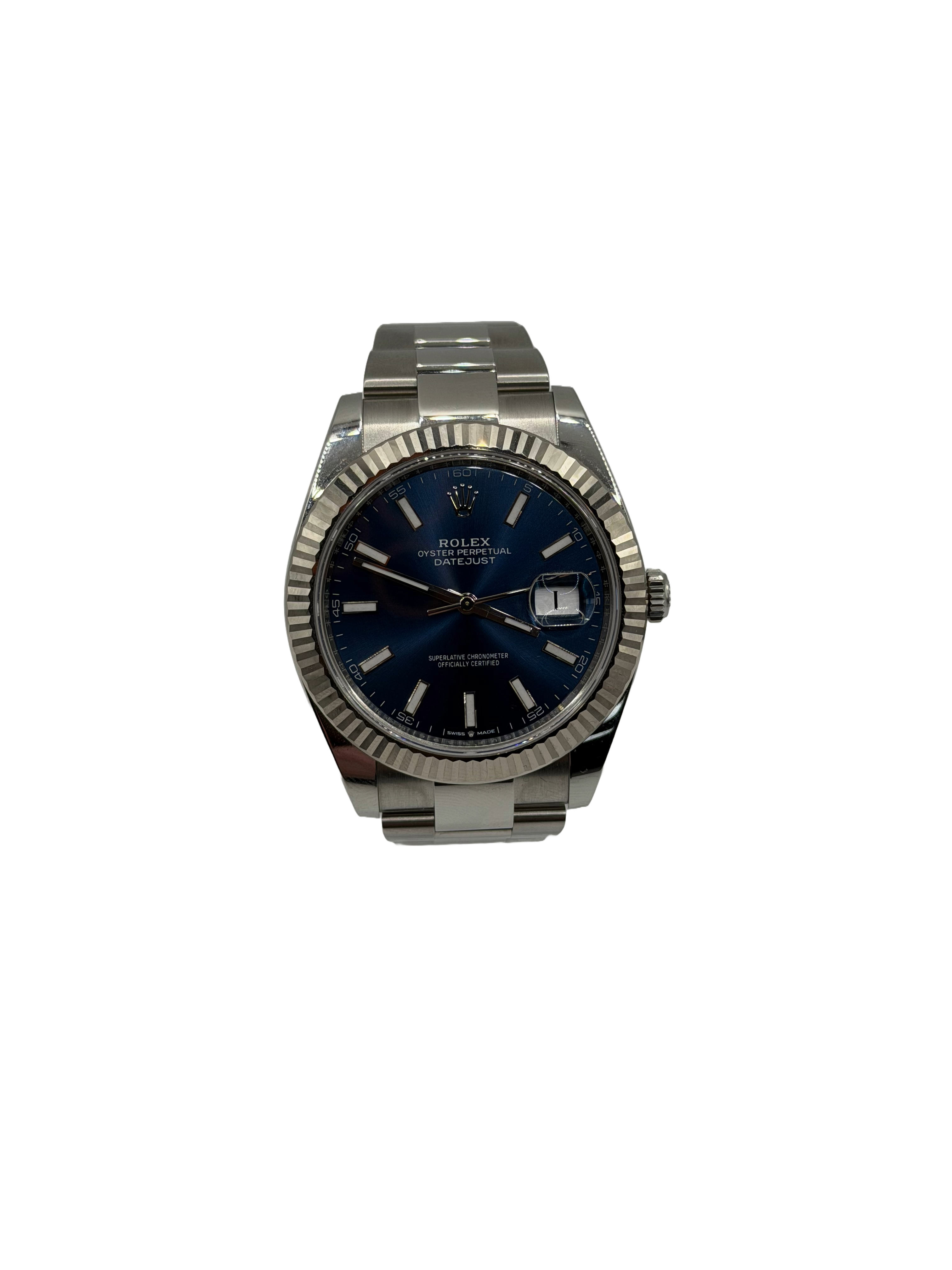 This Rolex Datejust 41 126334 has a blue baton dial and a bracelet strap. This Rolex has undergone a thorough inspection of water resistance, accuracy, functionality and condition to determine the level of reconditioning required to meet our strict standards. It has also been referenced against technical documents and manufacturer records where available to ensure authenticity and a clean history. Our watches have a 24-month warranty for your peace of mind, in conjunction with any remaining manufacturer’s warranty from new or from service. To maintain the manufacturer’s warranty on this watch, it has not been polished in our service centre.