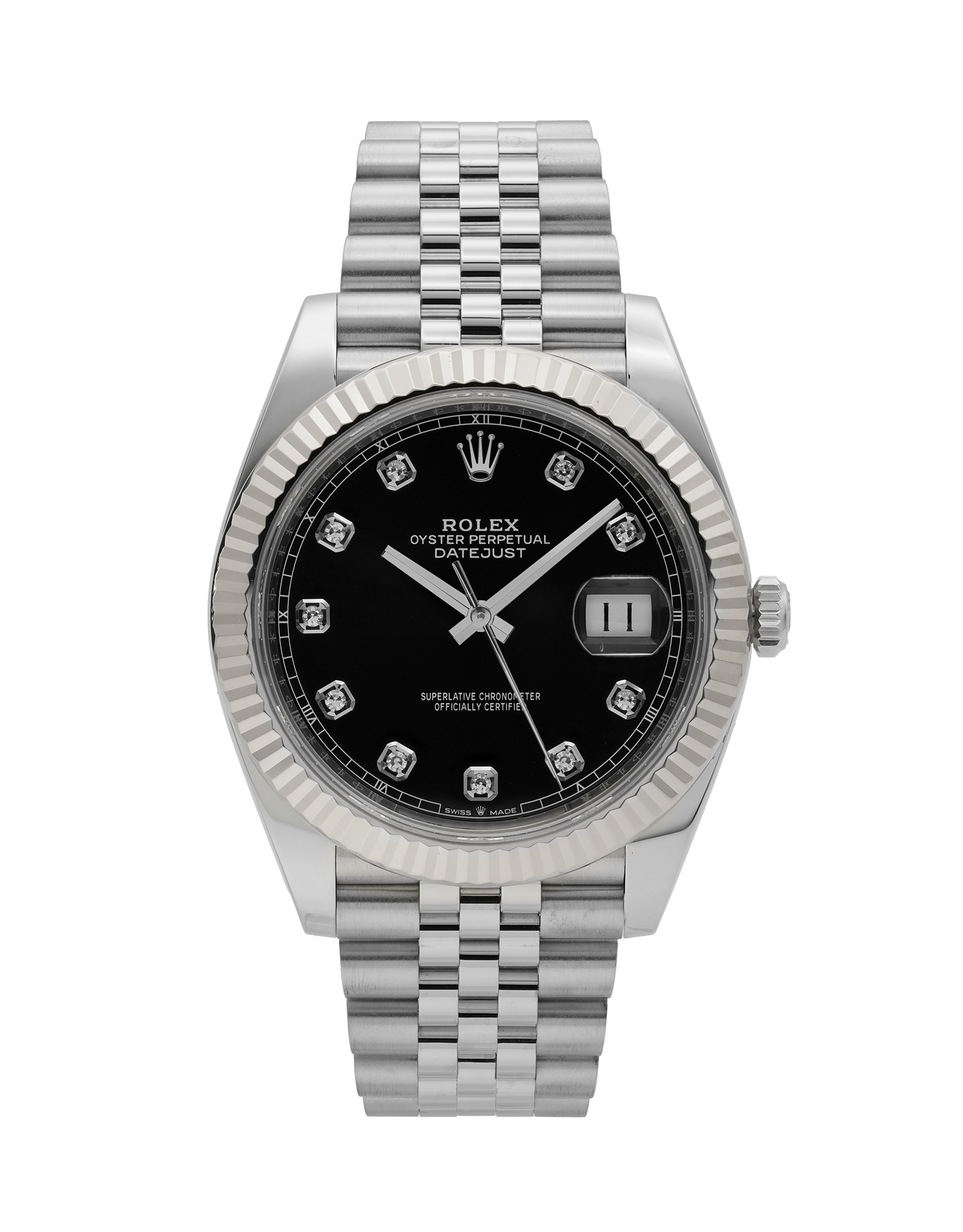 This Rolex Datejust 41 126334 has a black diamond dial and a bracelet strap. This Rolex has undergone a thorough inspection of water resistance, accuracy, functionality and condition to determine the level of reconditioning required to meet our strict standards. It has also been referenced against technical documents and manufacturer records where available to ensure authenticity and a clean history. All our watches have a 24-month warranty for your peace of mind. One of our skilled polishing technicians has removed marks on the case and bracelet of this watch, brought about by daily wear and tear, which is why this watch does not come with the remaining manufacturer’s warranty.