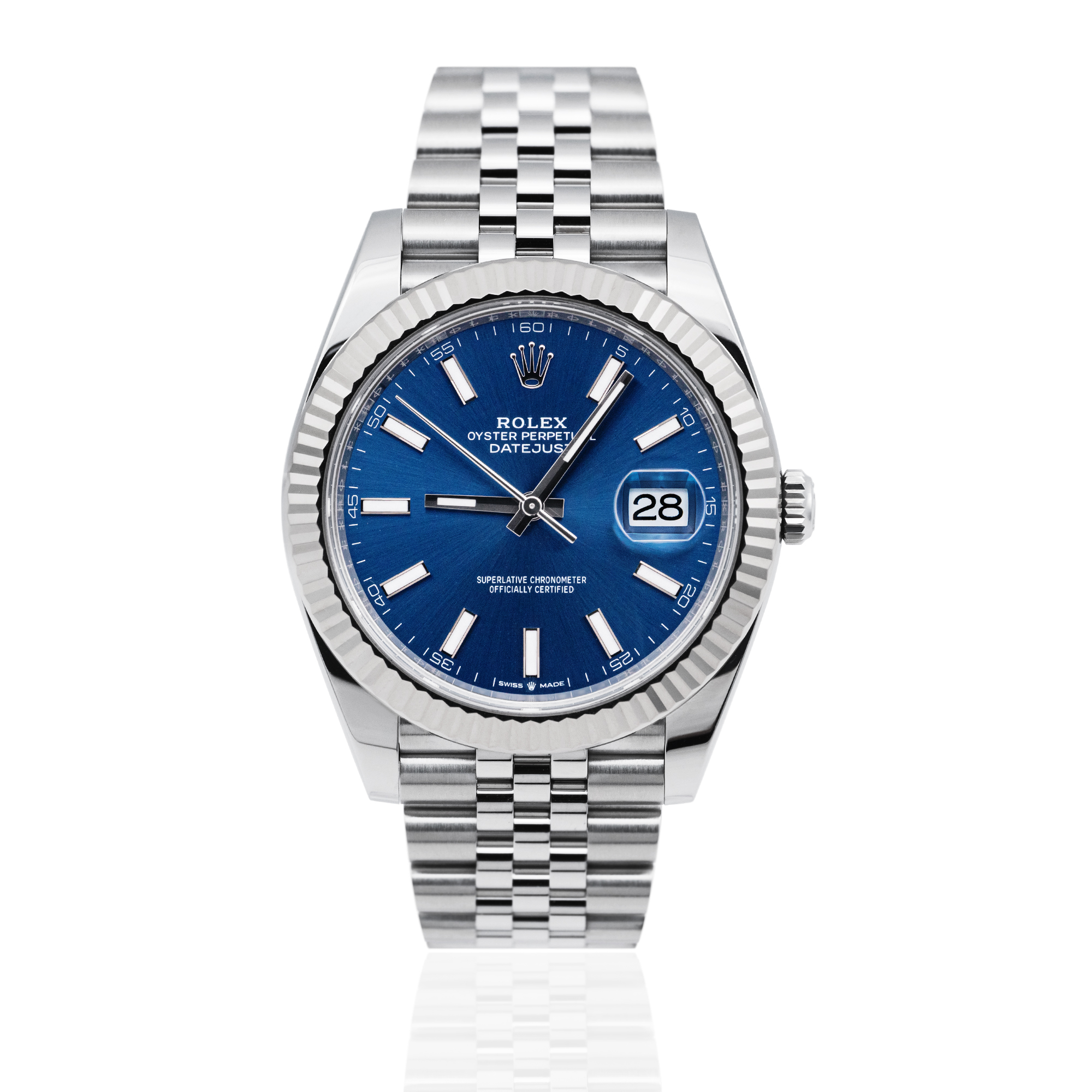 This Rolex Datejust 41 126334 has a blue baton dial and a bracelet strap. This Rolex has undergone a thorough inspection of water resistance, accuracy, functionality and condition to determine the level of reconditioning required to meet our strict standards. It has also been referenced against technical documents and manufacturer records where available to ensure authenticity and a clean history. Our watches have a 24-month warranty for your peace of mind, in conjunction with any remaining manufacturer’s warranty from new or from service. To maintain the manufacturer’s warranty on this watch, it has not been polished in our service centre.