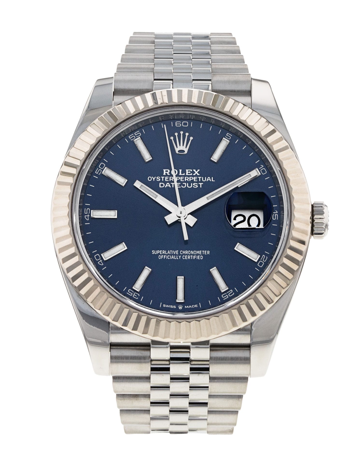 This Rolex Datejust 41 126334 has a blue baton dial and a bracelet strap. This Rolex has undergone a thorough inspection of water resistance, accuracy, functionality and condition to determine the level of reconditioning required to meet our strict standards. It has also been referenced against technical documents and manufacturer records where available to ensure authenticity and a clean history. All our watches have a 24-month warranty for your peace of mind. One of our skilled polishing technicians has removed marks on the case and bracelet of this watch, brought about by daily wear and tear, which is why this watch does not come with the remaining manufacturer’s warranty.