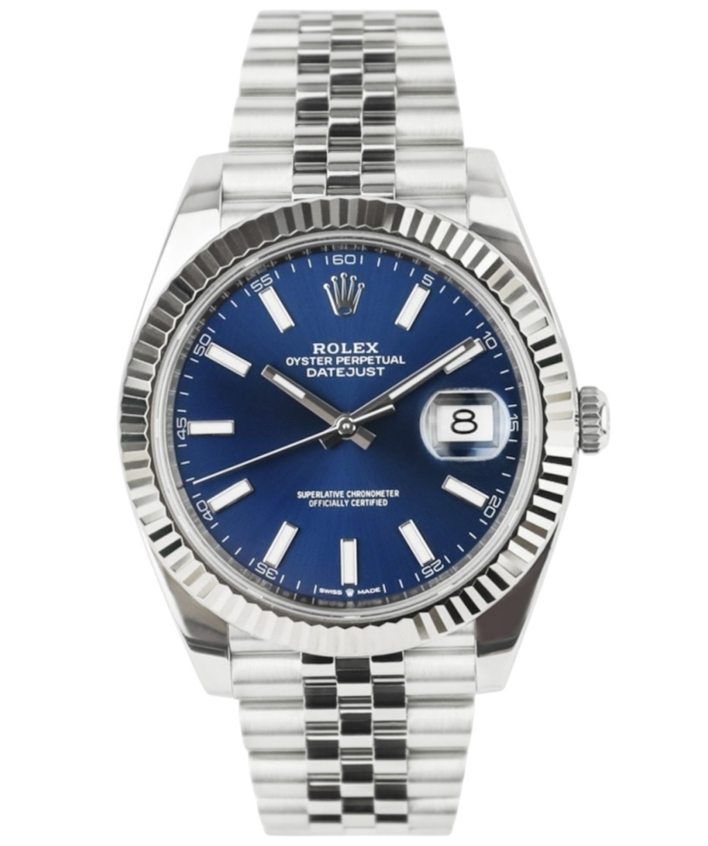 This Rolex Datejust 41 126334 has a blue baton dial and a bracelet strap. This Rolex has undergone a thorough inspection of water resistance, accuracy, functionality and condition to determine the level of reconditioning required to meet our strict standards. It has also been referenced against technical documents and manufacturer records where available to ensure authenticity and a clean history. All our watches have a 24-month warranty for your peace of mind. One of our skilled polishing technicians has removed marks on the case and bracelet of this watch, brought about by daily wear and tear, which is why this watch does not come with the remaining manufacturer’s warranty.