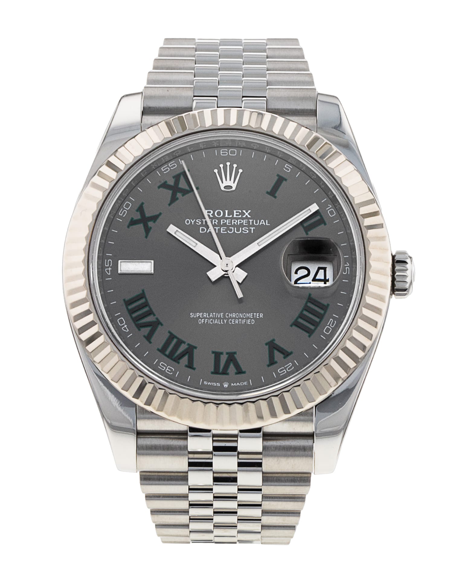 This Rolex Datejust 41 126334 has a slate roman numeral dial and a bracelet strap. This Rolex has undergone a thorough inspection of water resistance, accuracy, functionality and condition to determine the level of reconditioning required to meet our strict standards. It has also been referenced against technical documents and manufacturer records where available to ensure authenticity and a clean history. All our watches have a 24-month warranty for your peace of mind. One of our skilled polishing technicians has removed marks on the case and bracelet of this watch, brought about by daily wear and tear, which is why this watch does not come with the remaining manufacturer’s warranty.