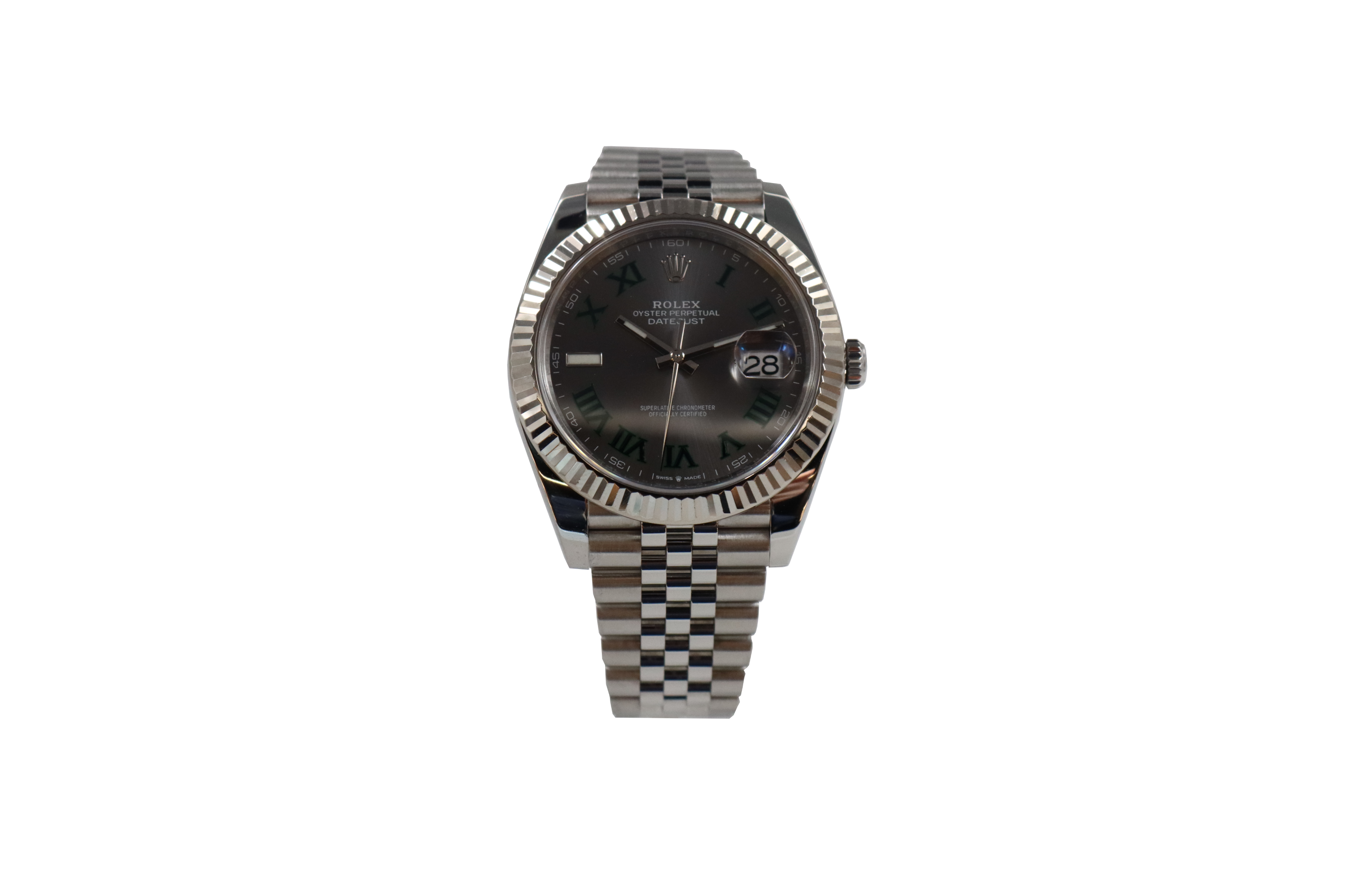 This Rolex Datejust 41 126334 has a slate roman numeral dial and a bracelet strap. This Rolex has undergone a thorough inspection of water resistance, accuracy, functionality and condition to determine the level of reconditioning required to meet our strict standards. It has also been referenced against technical documents and manufacturer records where available to ensure authenticity and a clean history. Our watches have a 24-month warranty for your peace of mind, in conjunction with any remaining manufacturer’s warranty from new or from service. To maintain the manufacturer’s warranty on this watch, it has not been polished in our service centre.