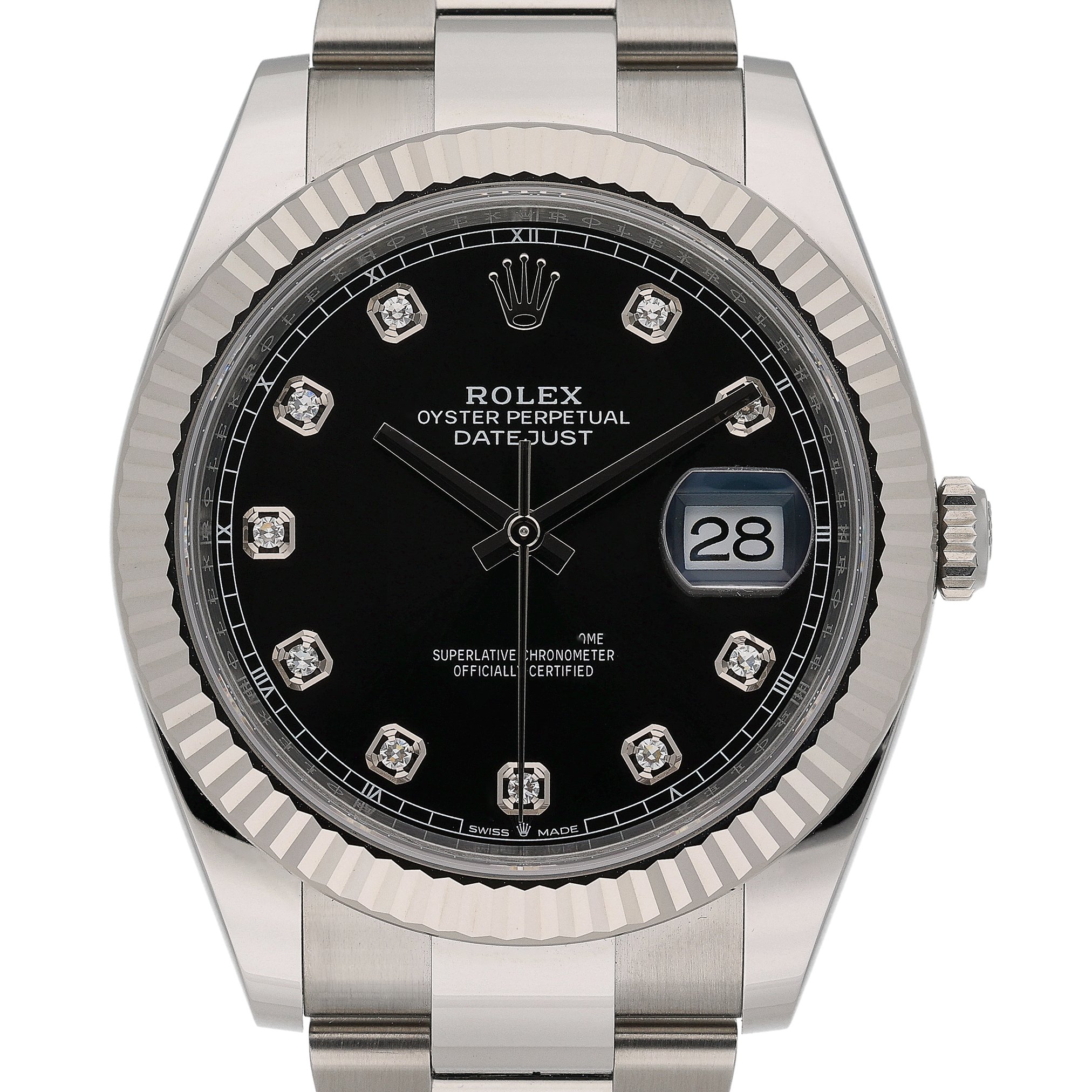 This Rolex Datejust 41 126334 has a black diamond dial and a bracelet strap. This Rolex has undergone a thorough inspection of water resistance, accuracy, functionality and condition to determine the level of reconditioning required to meet our strict standards. It has also been referenced against technical documents and manufacturer records where available to ensure authenticity and a clean history. Our watches have a 24-month warranty for your peace of mind, in conjunction with any remaining manufacturer’s warranty from new or from service. To maintain the manufacturer’s warranty on this watch, it has not been polished in our service centre.