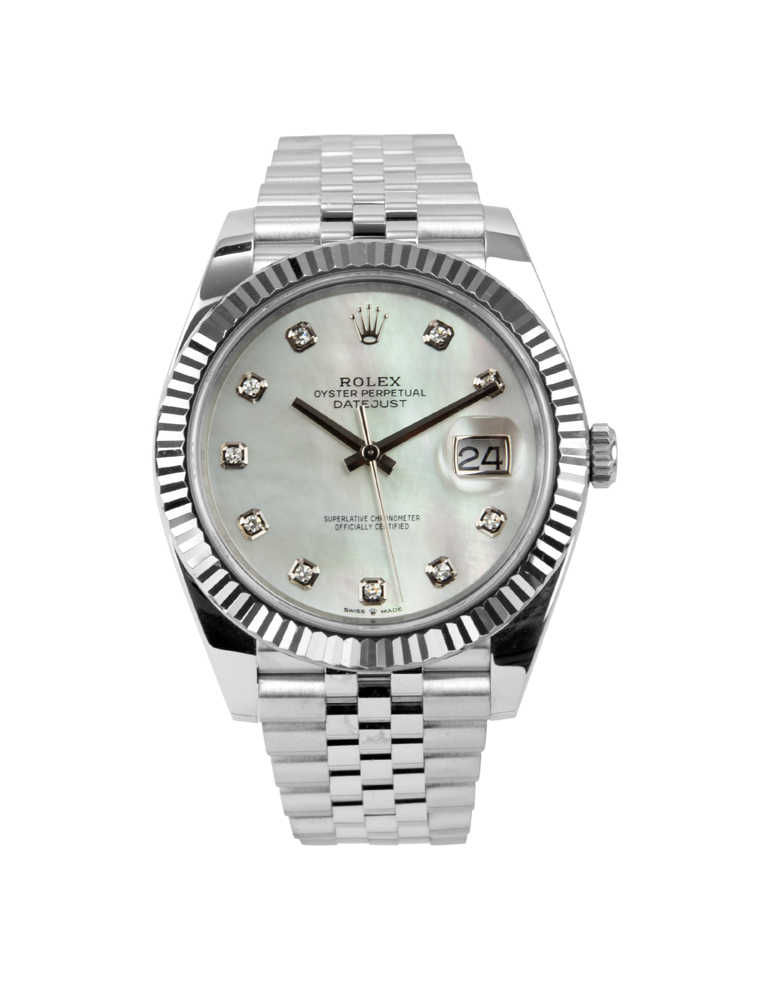 This Rolex Datejust 41 126334 has a mother of pearl white - diamond dial and a bracelet strap. This Rolex has undergone a thorough inspection of water resistance, accuracy, functionality and condition to determine the level of reconditioning required to meet our strict standards. It has also been referenced against technical documents and manufacturer records where available to ensure authenticity and a clean history. Our watches have a 24-month warranty for your peace of mind, in conjunction with any remaining manufacturer’s warranty from new or from service. To maintain the manufacturer’s warranty on this watch, it has not been polished in our service centre.