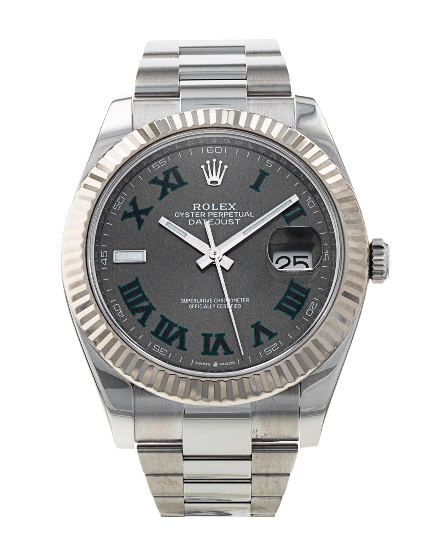 This Rolex Datejust 41 126334 has a slate roman numeral dial and a bracelet strap. This Rolex has undergone a thorough inspection of water resistance, accuracy, functionality and condition to determine the level of reconditioning required to meet our strict standards. It has also been referenced against technical documents and manufacturer records where available to ensure authenticity and a clean history. All our watches have a 24-month warranty for your peace of mind. One of our skilled polishing technicians has removed marks on the case and bracelet of this watch, brought about by daily wear and tear, which is why this watch does not come with the remaining manufacturer’s warranty.