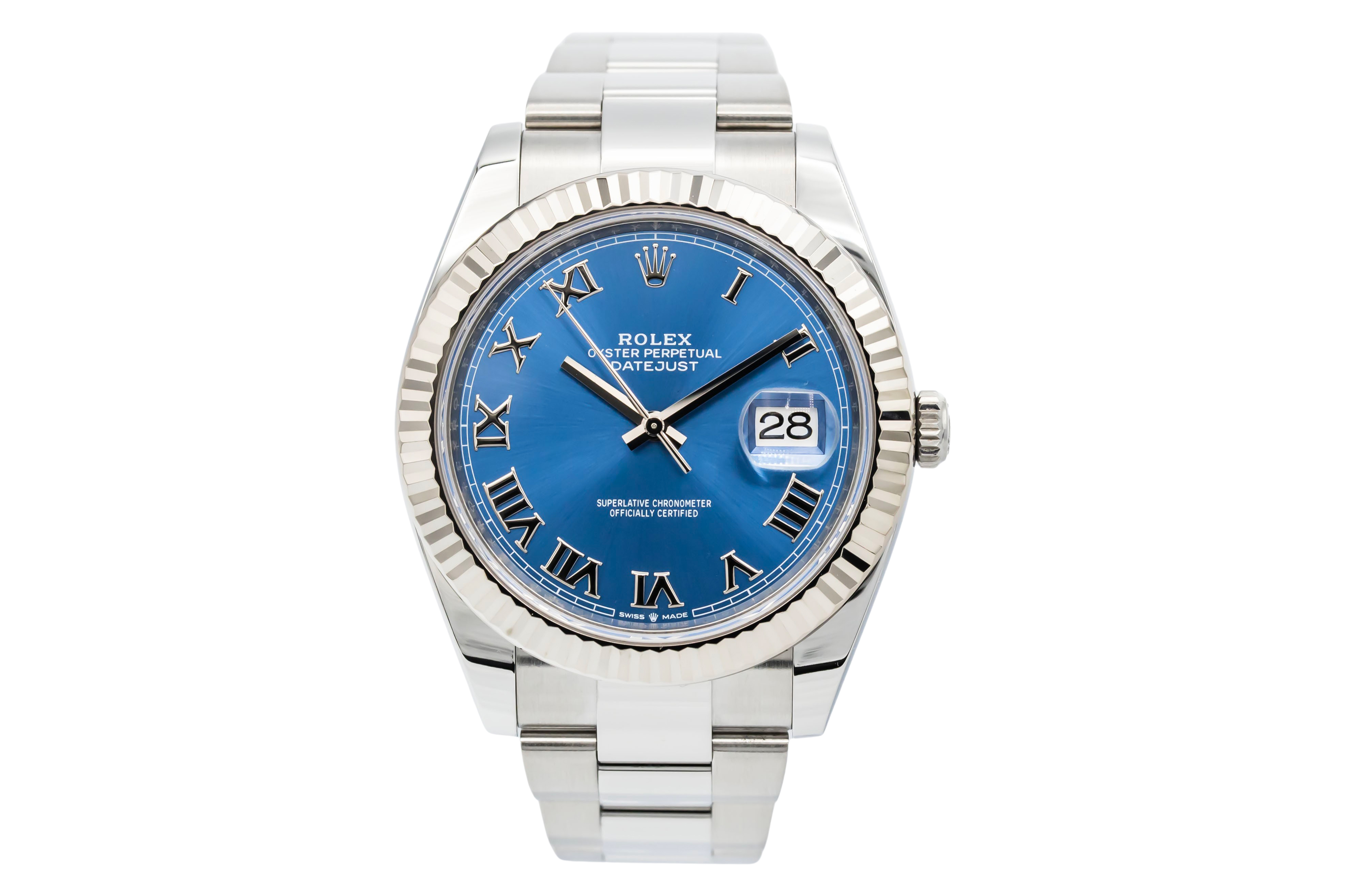This Rolex Datejust 41 126334 has a blue roman numeral dial and a bracelet strap. This Rolex has undergone a thorough inspection of water resistance, accuracy, functionality and condition to determine the level of reconditioning required to meet our strict standards. It has also been referenced against technical documents and manufacturer records where available to ensure authenticity and a clean history. Our watches have a 24-month warranty for your peace of mind, in conjunction with any remaining manufacturer’s warranty from new or from service. To maintain the manufacturer’s warranty on this watch, it has not been polished in our service centre.