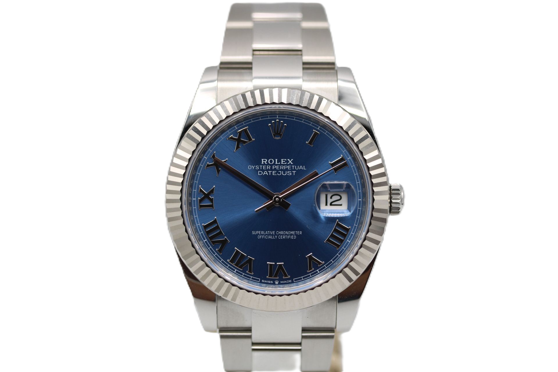 This Rolex Datejust 41 126334 has a blue roman numeral dial and a bracelet strap. This Rolex has undergone a thorough inspection of water resistance, accuracy, functionality and condition to determine the level of reconditioning required to meet our strict standards. It has also been referenced against technical documents and manufacturer records where available to ensure authenticity and a clean history. Our watches have a 24-month warranty for your peace of mind, in conjunction with any remaining manufacturer’s warranty from new or from service. To maintain the manufacturer’s warranty on this watch, it has not been polished in our service centre.