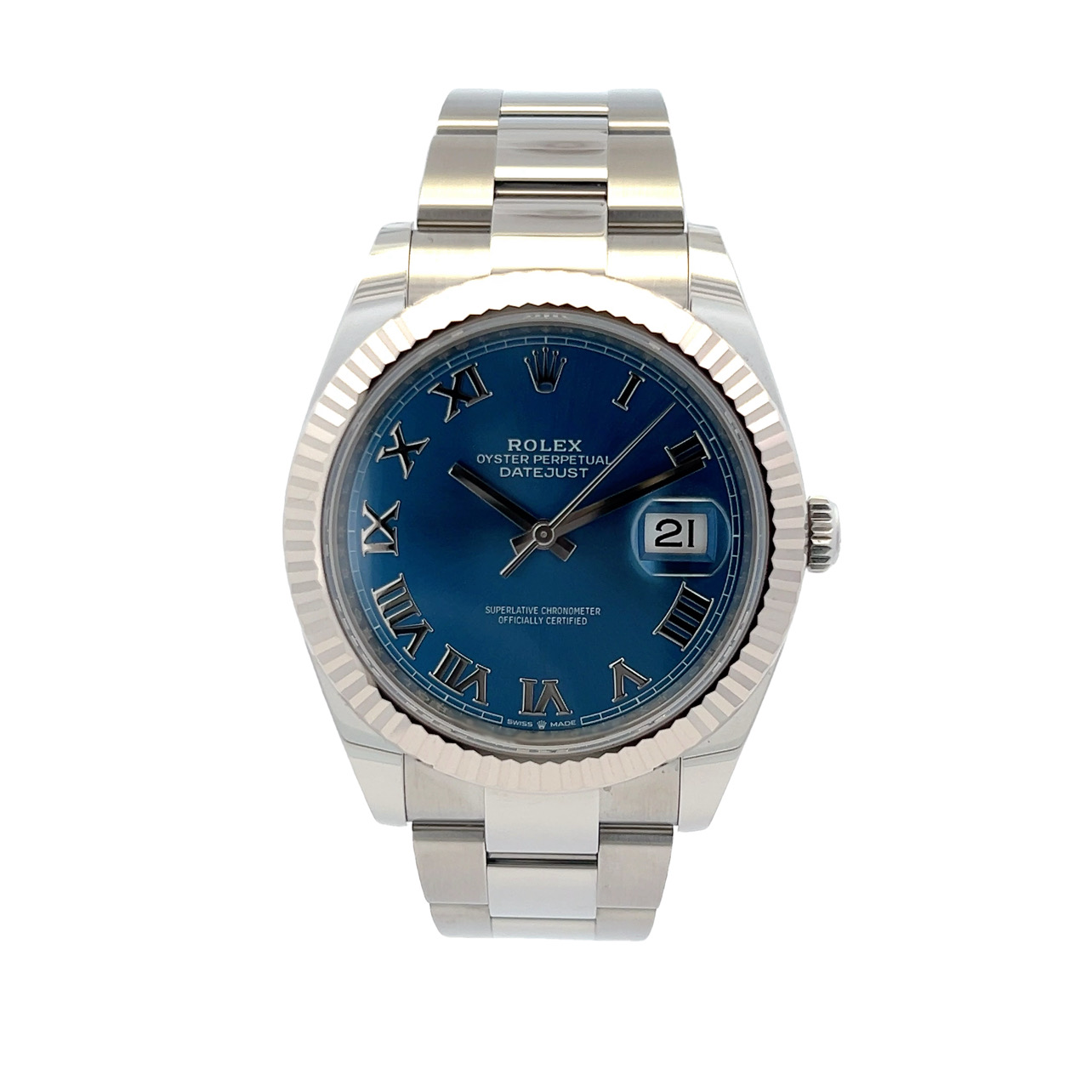 This Rolex Datejust 41 126334 has a blue roman numeral dial and a bracelet strap. This Rolex has undergone a thorough inspection of water resistance, accuracy, functionality and condition to determine the level of reconditioning required to meet our strict standards. It has also been referenced against technical documents and manufacturer records where available to ensure authenticity and a clean history. Our watches have a 24-month warranty for your peace of mind, in conjunction with any remaining manufacturer’s warranty from new or from service. To maintain the manufacturer’s warranty on this watch, it has not been polished in our service centre.