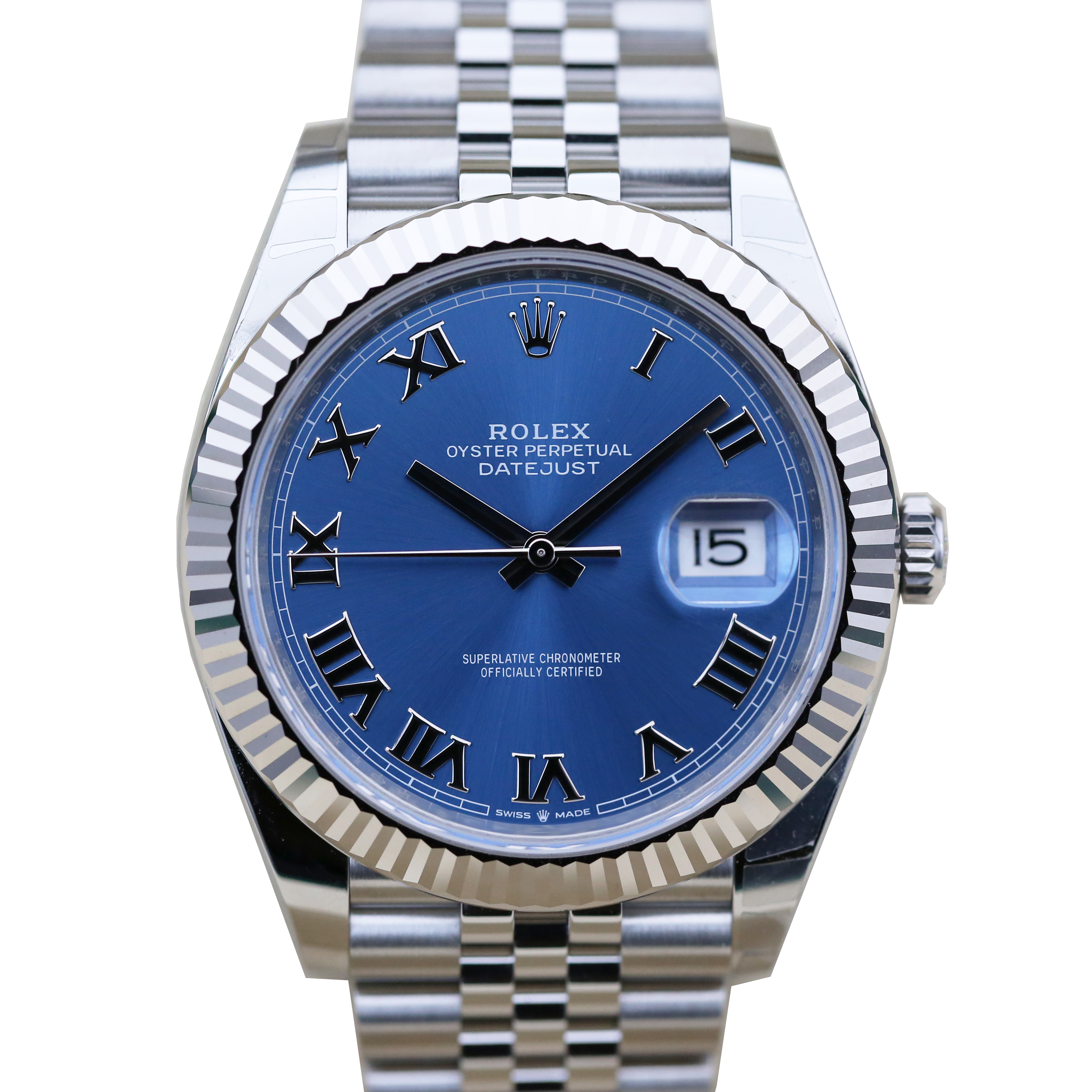 This Rolex Datejust 41 126334 has a blue roman numeral dial and a bracelet strap. This Rolex has undergone a thorough inspection of water resistance, accuracy, functionality and condition to determine the level of reconditioning required to meet our strict standards. It has also been referenced against technical documents and manufacturer records where available to ensure authenticity and a clean history. Our watches have a 24-month warranty for your peace of mind, in conjunction with any remaining manufacturer’s warranty from new or from service. To maintain the manufacturer’s warranty on this watch, it has not been polished in our service centre.