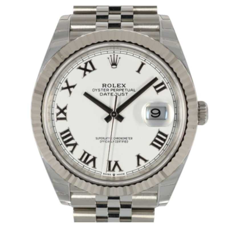 This Rolex Datejust 41 126334 has a white roman numeral dial and a bracelet strap. This Rolex has undergone a thorough inspection of water resistance, accuracy, functionality and condition to determine the level of reconditioning required to meet our strict standards. It has also been referenced against technical documents and manufacturer records where available to ensure authenticity and a clean history. Our watches have a 24-month warranty for your peace of mind, in conjunction with any remaining manufacturer’s warranty from new or from service. To maintain the manufacturer’s warranty on this watch, it has not been polished in our service centre.