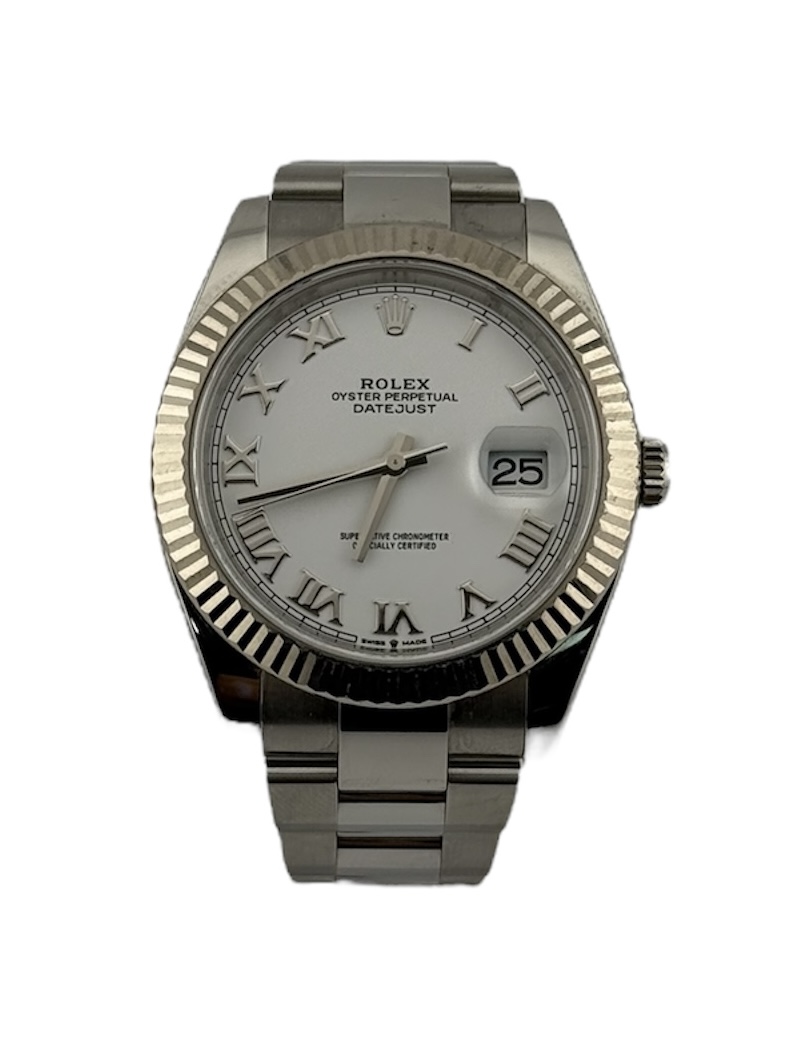 This Rolex Datejust 41 126334 has a white roman numeral dial and a bracelet strap. This Rolex has undergone a thorough inspection of water resistance, accuracy, functionality and condition to determine the level of reconditioning required to meet our strict standards. It has also been referenced against technical documents and manufacturer records where available to ensure authenticity and a clean history. All our watches have a 24-month warranty for your peace of mind. One of our skilled polishing technicians has removed marks on the case and bracelet of this watch, brought about by daily wear and tear, which is why this watch does not come with the remaining manufacturer’s warranty.