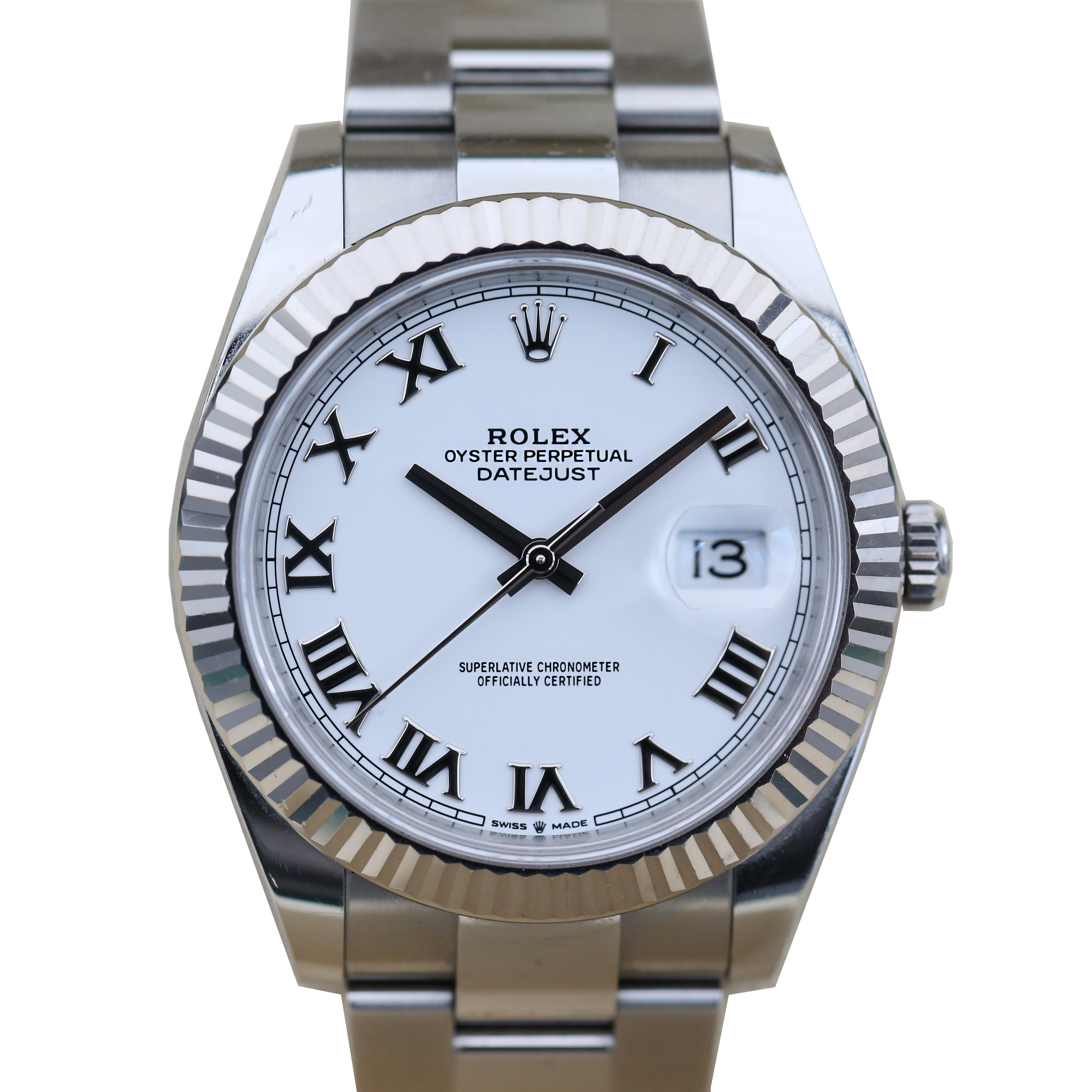 This Rolex Datejust 41 126334 has a white roman numeral dial and a bracelet strap. This Rolex has undergone a thorough inspection of water resistance, accuracy, functionality and condition to determine the level of reconditioning required to meet our strict standards. It has also been referenced against technical documents and manufacturer records where available to ensure authenticity and a clean history. Our watches have a 24-month warranty for your peace of mind, in conjunction with any remaining manufacturer’s warranty from new or from service. To maintain the manufacturer’s warranty on this watch, it has not been polished in our service centre.