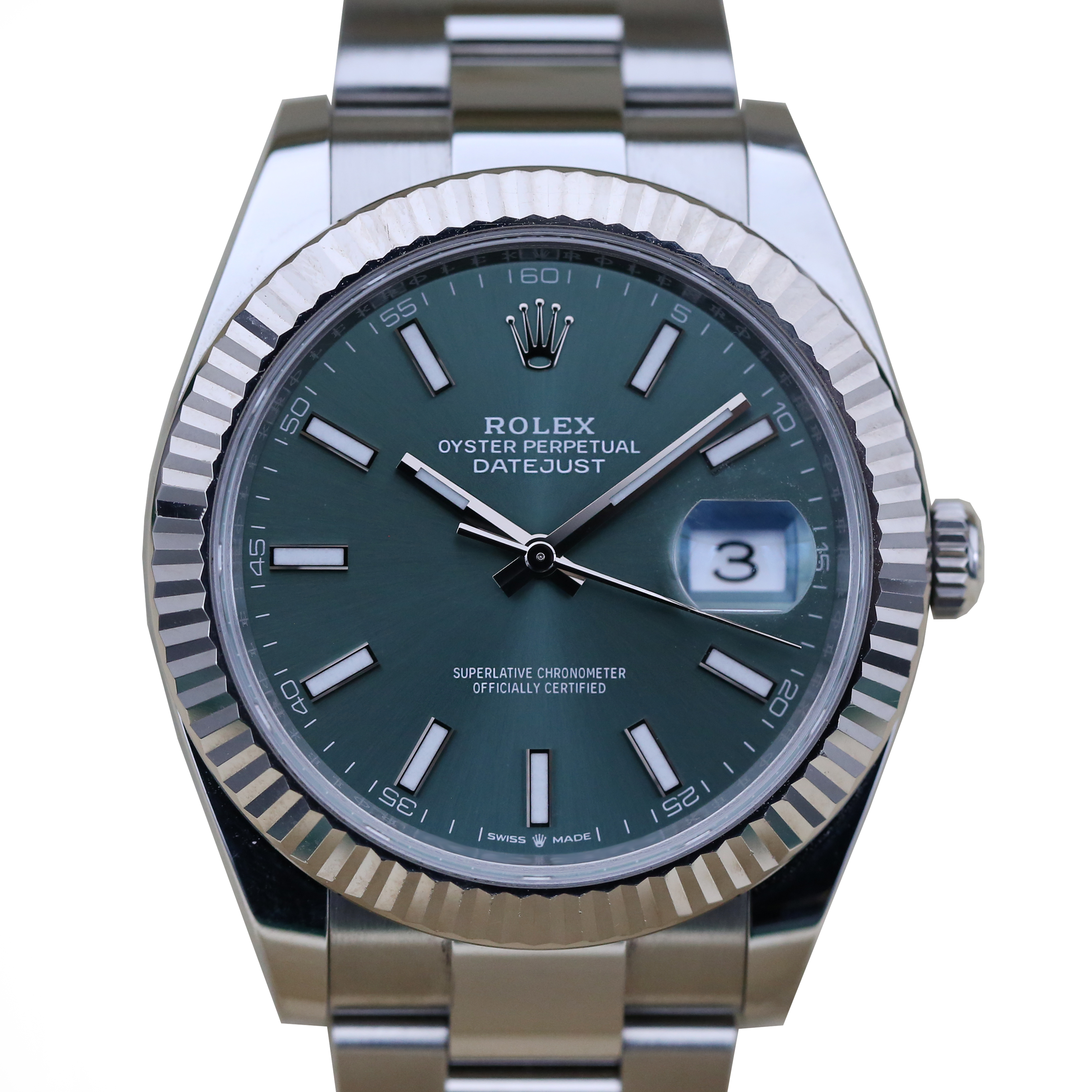 This Rolex Datejust 41 126334 has a mint green baton dial and a bracelet strap. This Rolex has undergone a thorough inspection of water resistance, accuracy, functionality and condition to determine the level of reconditioning required to meet our strict standards. It has also been referenced against technical documents and manufacturer records where available to ensure authenticity and a clean history. Our watches have a 24-month warranty for your peace of mind, in conjunction with any remaining manufacturer’s warranty from new or from service. To maintain the manufacturer’s warranty on this watch, it has not been polished in our service centre.