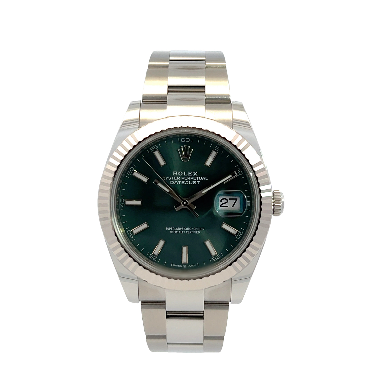 This Rolex Datejust 41 126334 has a mint green baton dial and a bracelet strap. This Rolex has undergone a thorough inspection of water resistance, accuracy, functionality and condition to determine the level of reconditioning required to meet our strict standards. It has also been referenced against technical documents and manufacturer records where available to ensure authenticity and a clean history. Our watches have a 24-month warranty for your peace of mind, in conjunction with any remaining manufacturer’s warranty from new or from service. To maintain the manufacturer’s warranty on this watch, it has not been polished in our service centre.