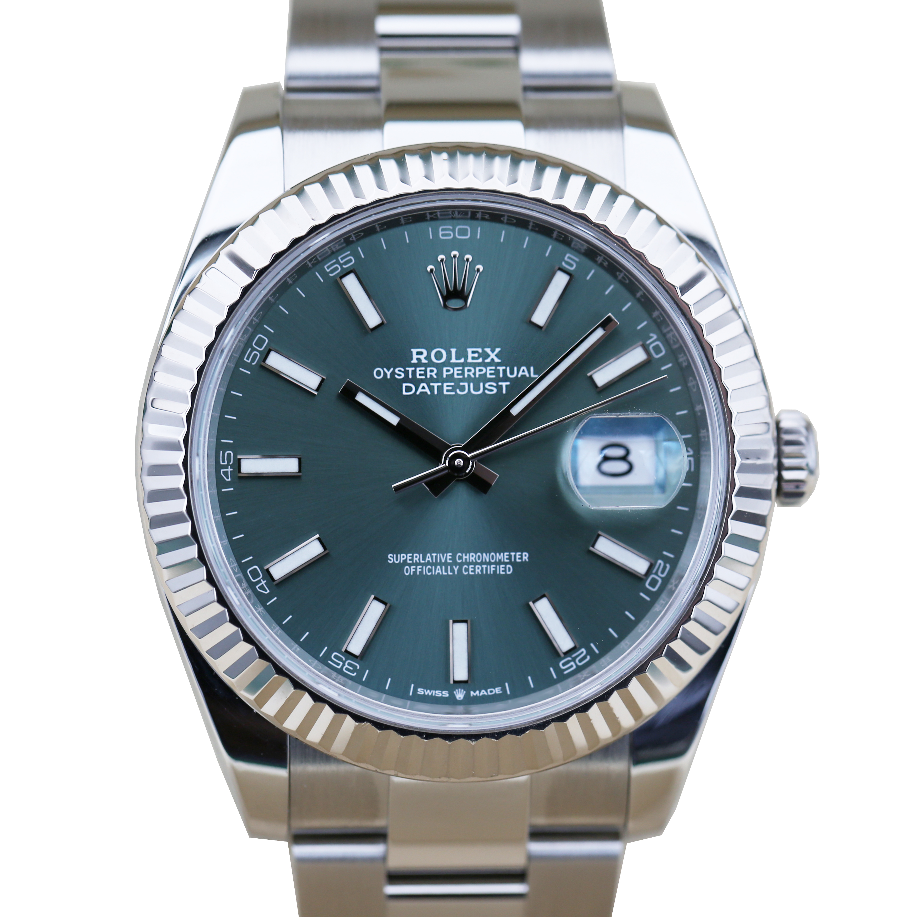 This Rolex Datejust 41 126334 has a mint green baton dial and a bracelet strap. This Rolex has undergone a thorough inspection of water resistance, accuracy, functionality and condition to determine the level of reconditioning required to meet our strict standards. It has also been referenced against technical documents and manufacturer records where available to ensure authenticity and a clean history. All our watches have a 24-month warranty for your peace of mind. One of our skilled polishing technicians has removed marks on the case and bracelet of this watch, brought about by daily wear and tear, which is why this watch does not come with the remaining manufacturer’s warranty.