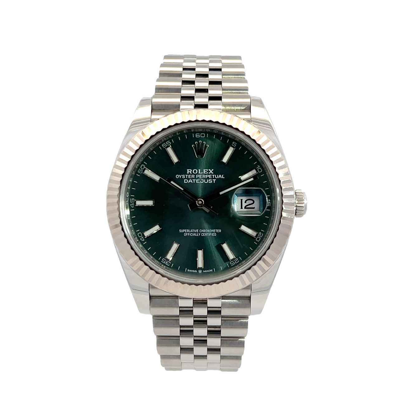 This Rolex Datejust 41 126334 has a mint green baton dial and a bracelet strap. This Rolex has undergone a thorough inspection of water resistance, accuracy, functionality and condition to determine the level of reconditioning required to meet our strict standards. It has also been referenced against technical documents and manufacturer records where available to ensure authenticity and a clean history. Our watches have a 24-month warranty for your peace of mind, in conjunction with any remaining manufacturer’s warranty from new or from service. To maintain the manufacturer’s warranty on this watch, it has not been polished in our service centre.