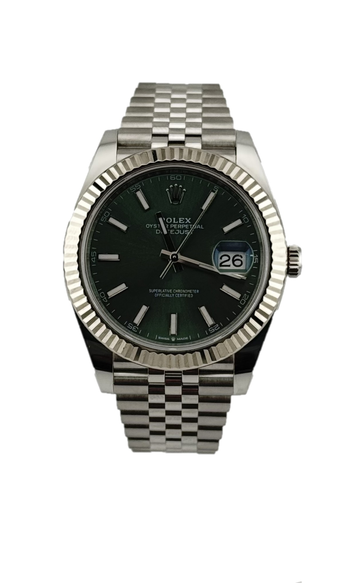 This Rolex Datejust 41 126334 has a mint green baton dial and a bracelet strap. This Rolex has undergone a thorough inspection of water resistance, accuracy, functionality and condition to determine the level of reconditioning required to meet our strict standards. It has also been referenced against technical documents and manufacturer records where available to ensure authenticity and a clean history. Our watches have a 24-month warranty for your peace of mind, in conjunction with any remaining manufacturer’s warranty from new or from service. To maintain the manufacturer’s warranty on this watch, it has not been polished in our service centre.