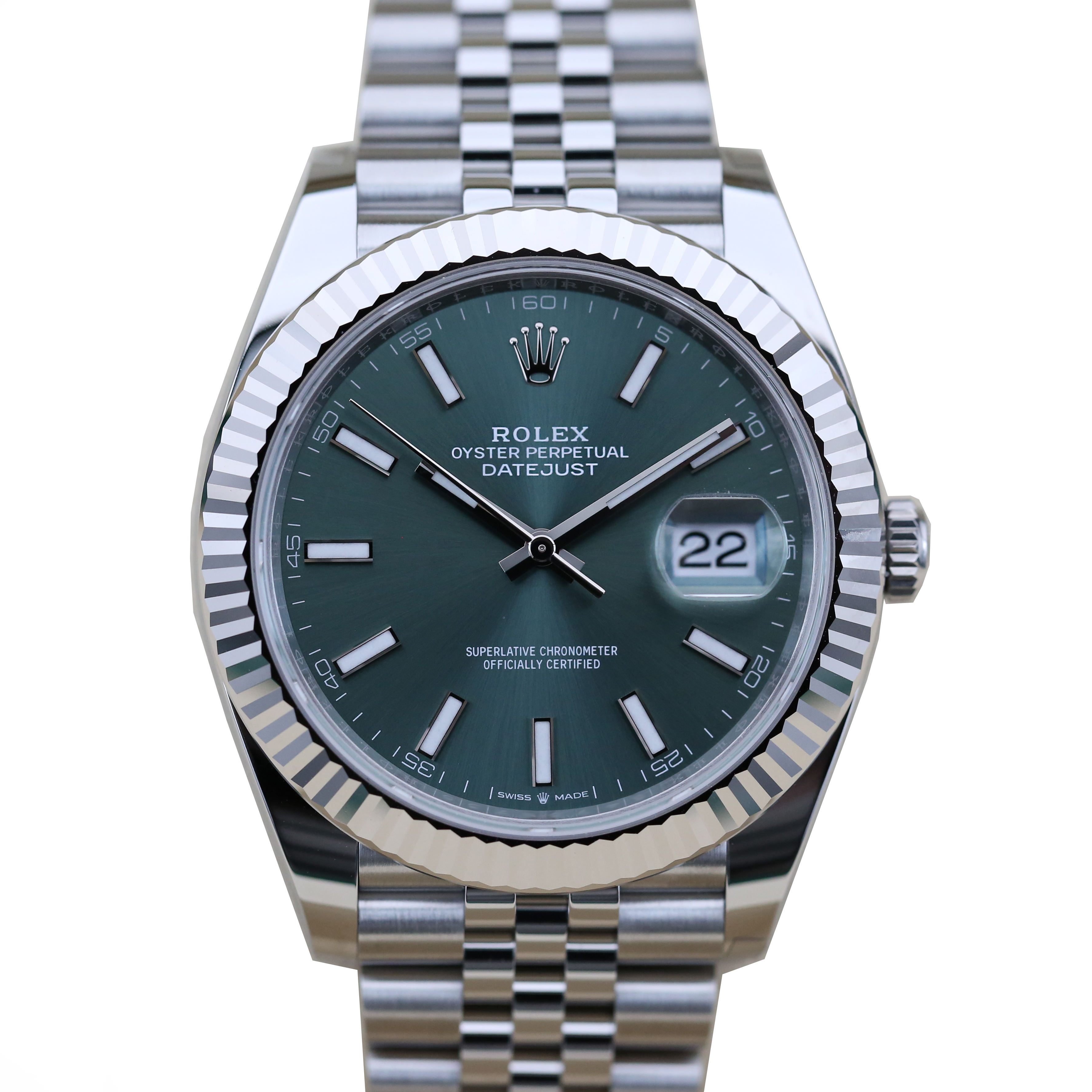 This Rolex Datejust 41 126334 has a mint green baton dial and a bracelet strap. This Rolex has undergone a thorough inspection of water resistance, accuracy, functionality and condition to determine the level of reconditioning required to meet our strict standards. It has also been referenced against technical documents and manufacturer records where available to ensure authenticity and a clean history. Our watches have a 24-month warranty for your peace of mind, in conjunction with any remaining manufacturer’s warranty from new or from service. To maintain the manufacturer’s warranty on this watch, it has not been polished in our service centre.