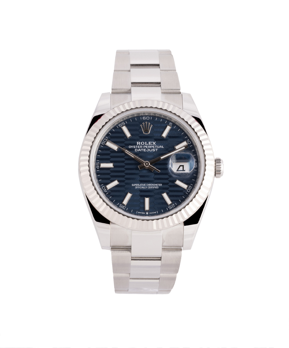 This Rolex Datejust 41 126334 has a blue fluted motif dial and a bracelet strap. This Rolex has undergone a thorough inspection of water resistance, accuracy, functionality and condition to determine the level of reconditioning required to meet our strict standards. It has also been referenced against technical documents and manufacturer records where available to ensure authenticity and a clean history. Our watches have a 24-month warranty for your peace of mind, in conjunction with any remaining manufacturer’s warranty from new or from service. To maintain the manufacturer’s warranty on this watch, it has not been polished in our service centre.
