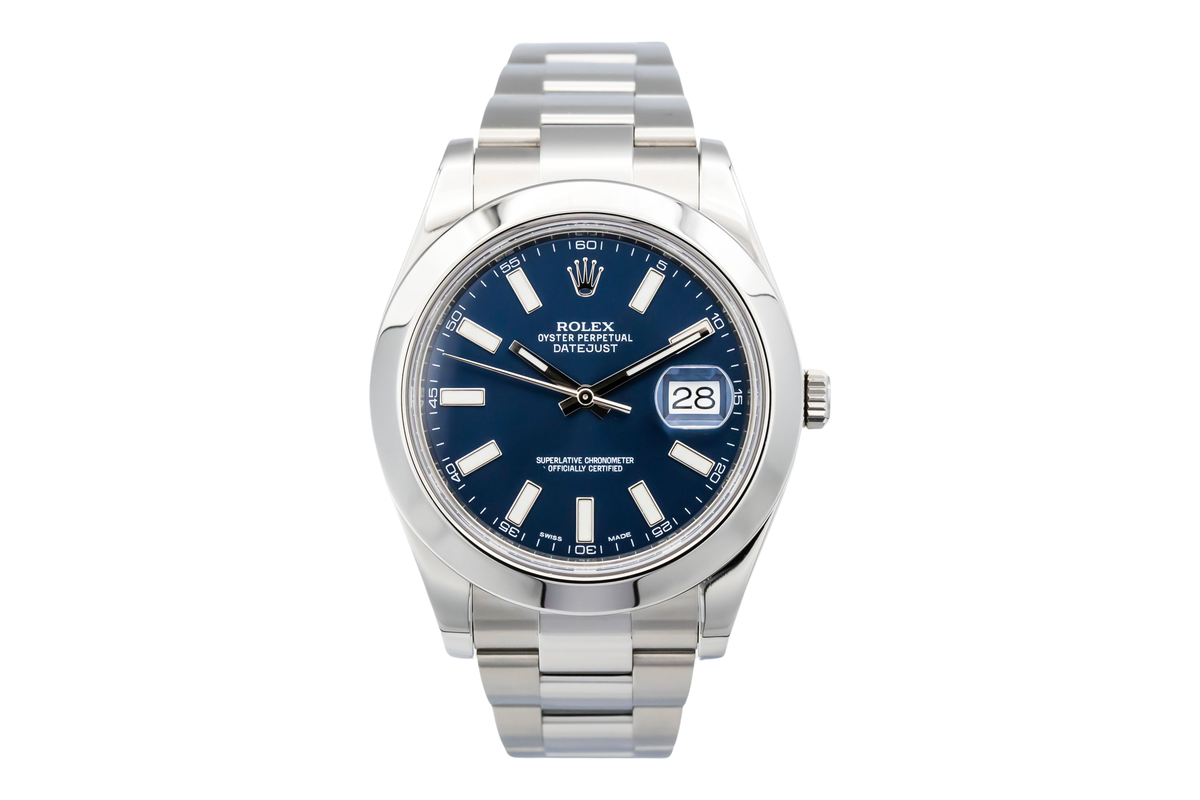 This Rolex Datejust II 116300 has a blue baton dial and a bracelet strap. This Rolex has undergone a thorough inspection of water resistance, accuracy, functionality and condition to determine the level of reconditioning required to meet our strict standards. It has also been referenced against technical documents and manufacturer records where available to ensure authenticity and a clean history. All our watches have a 24-month warranty for your peace of mind. One of our skilled polishing technicians has removed marks on the case and bracelet of this watch, brought about by daily wear and tear, which is why this watch does not come with the remaining manufacturer’s warranty.