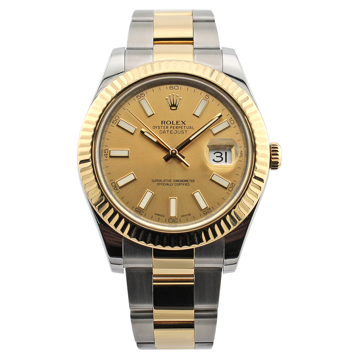 This Rolex Datejust II 116333 has a champagne baton dial and a bracelet strap. This Rolex has undergone a thorough inspection of water resistance, accuracy, functionality and condition to determine the level of reconditioning required to meet our strict standards. It has also been referenced against technical documents and manufacturer records where available to ensure authenticity and a clean history. All our watches have a 24-month warranty for your peace of mind. One of our skilled polishing technicians has removed marks on the case and bracelet of this watch, brought about by daily wear and tear, which is why this watch does not come with the remaining manufacturer’s warranty.
