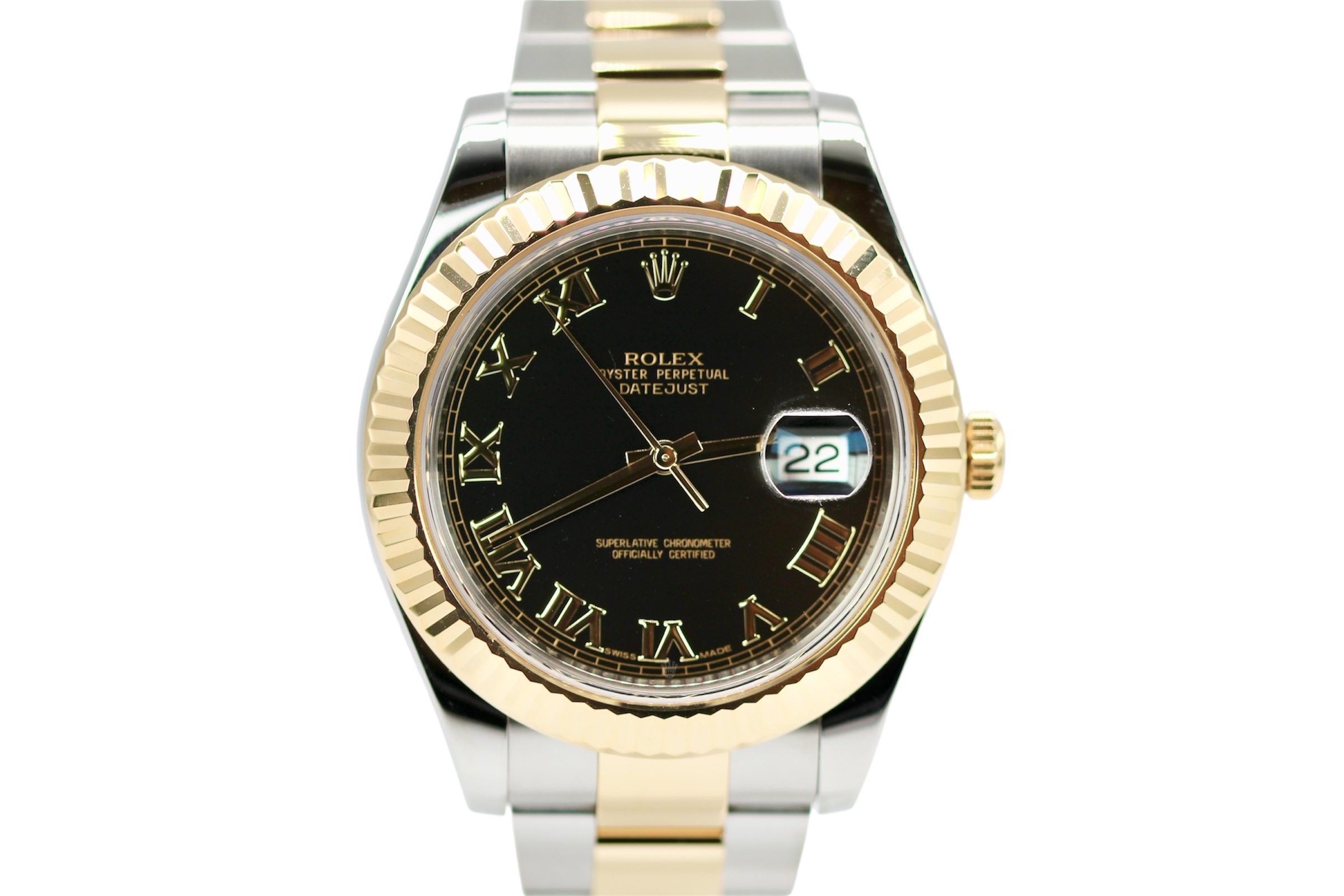 This Rolex Datejust II 116333 has a black roman numeral dial and a bracelet strap. This Rolex has undergone a thorough inspection of water resistance, accuracy, functionality and condition to determine the level of reconditioning required to meet our strict standards. It has also been referenced against technical documents and manufacturer records where available to ensure authenticity and a clean history. All our watches have a 24-month warranty for your peace of mind. One of our skilled polishing technicians has removed marks on the case and bracelet of this watch, brought about by daily wear and tear, which is why this watch does not come with the remaining manufacturer’s warranty.
