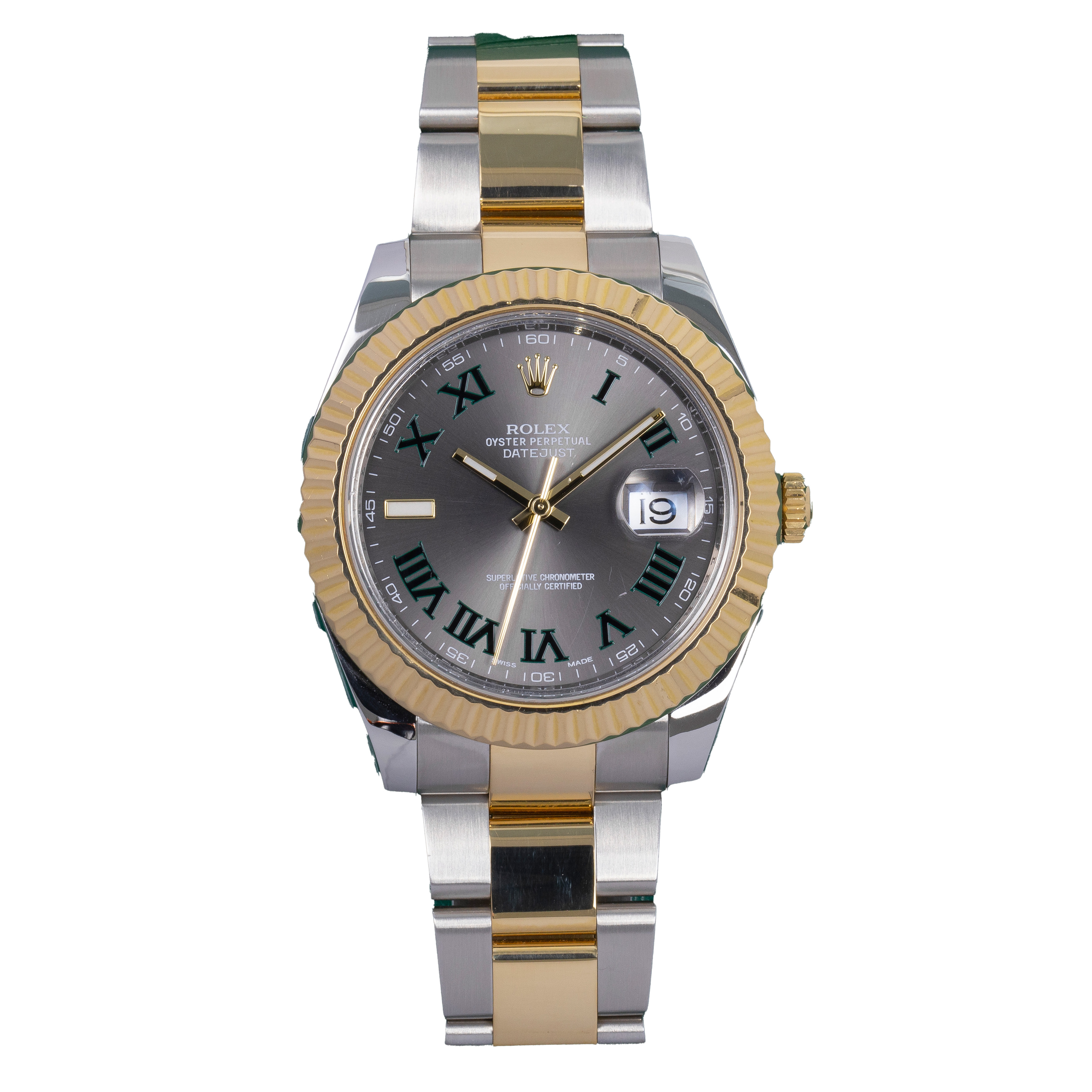This Rolex Datejust II 116333 has a slate roman numeral dial and a bracelet strap. This Rolex has undergone a thorough inspection of water resistance, accuracy, functionality and condition to determine the level of reconditioning required to meet our strict standards. It has also been referenced against technical documents and manufacturer records where available to ensure authenticity and a clean history. All our watches have a 24-month warranty for your peace of mind. One of our skilled polishing technicians has removed marks on the case and bracelet of this watch, brought about by daily wear and tear, which is why this watch does not come with the remaining manufacturer’s warranty.