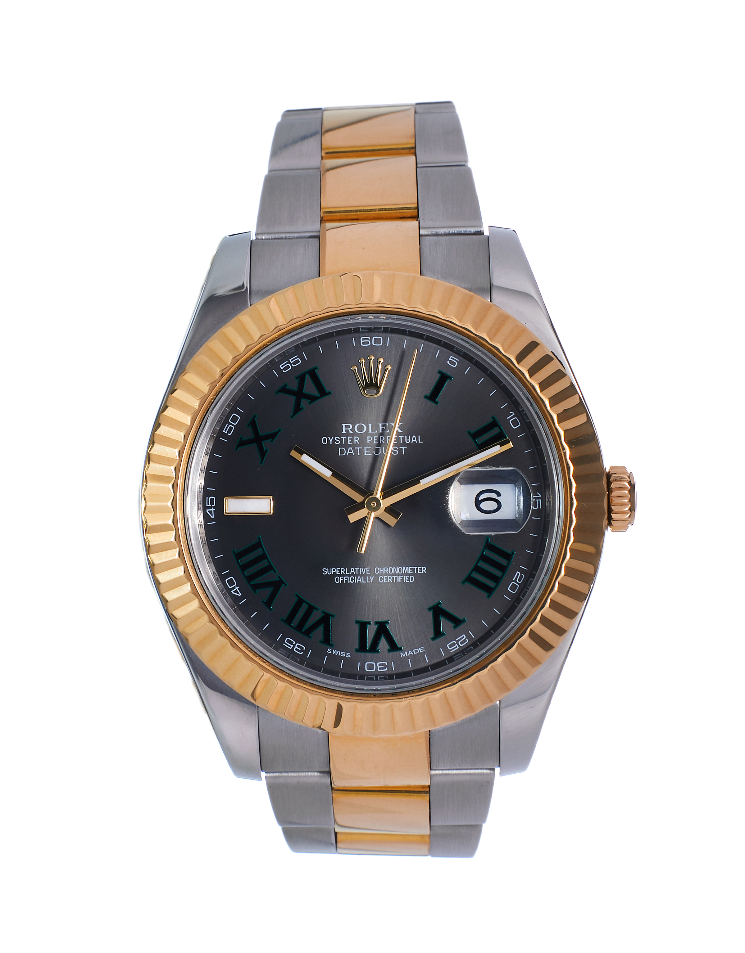 This Rolex Datejust II 116333 has a slate roman numeral dial and a bracelet strap. This Rolex has undergone a thorough inspection of water resistance, accuracy, functionality and condition to determine the level of reconditioning required to meet our strict standards. It has also been referenced against technical documents and manufacturer records where available to ensure authenticity and a clean history. All our watches have a 24-month warranty for your peace of mind. One of our skilled polishing technicians has removed marks on the case and bracelet of this watch, brought about by daily wear and tear, which is why this watch does not come with the remaining manufacturer’s warranty.
