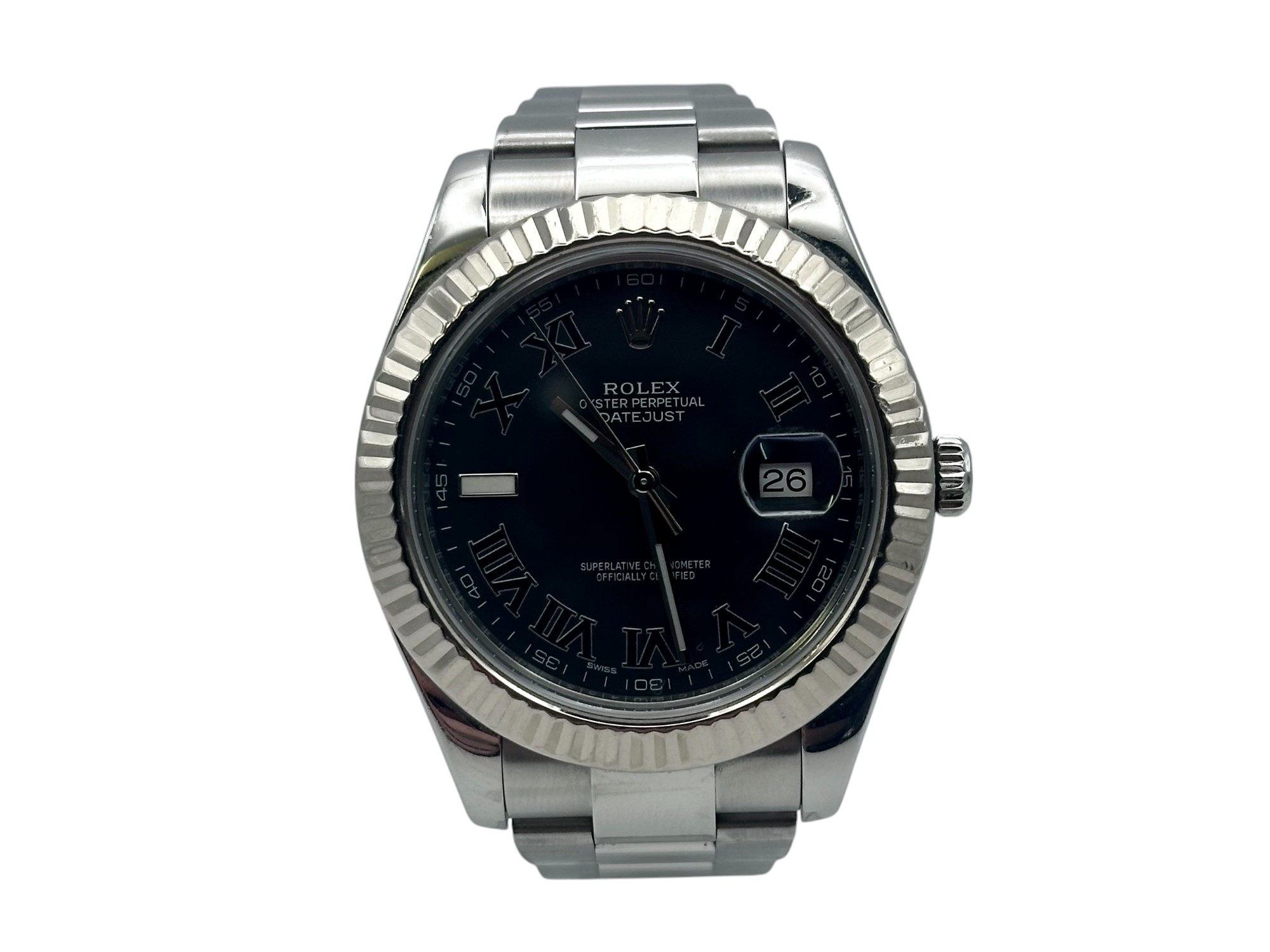 This Rolex Datejust II 116334 has a black roman numeral dial and a bracelet strap. This Rolex has undergone a thorough inspection of water resistance, accuracy, functionality and condition to determine the level of reconditioning required to meet our strict standards. It has also been referenced against technical documents and manufacturer records where available to ensure authenticity and a clean history. All our watches have a 24-month warranty for your peace of mind. One of our skilled polishing technicians has removed marks on the case and bracelet of this watch, brought about by daily wear and tear, which is why this watch does not come with the remaining manufacturer’s warranty.