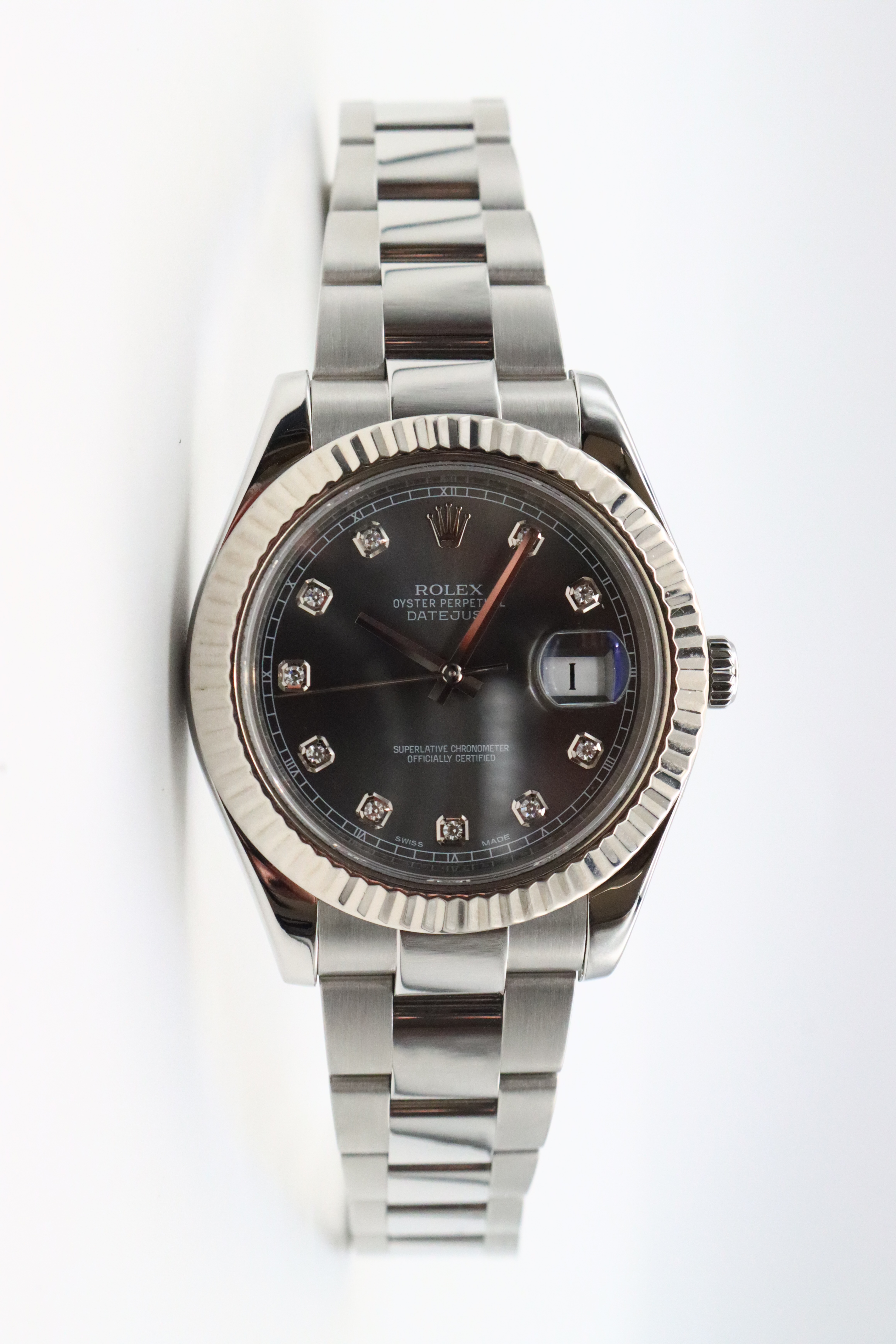 This Rolex Datejust II 116334 has a rhodium diamond dial and a bracelet strap. This Rolex has undergone a thorough inspection of water resistance, accuracy, functionality and condition to determine the level of reconditioning required to meet our strict standards. It has also been referenced against technical documents and manufacturer records where available to ensure authenticity and a clean history. All our watches have a 24-month warranty for your peace of mind. One of our skilled polishing technicians has removed marks on the case and bracelet of this watch, brought about by daily wear and tear, which is why this watch does not come with the remaining manufacturer’s warranty.