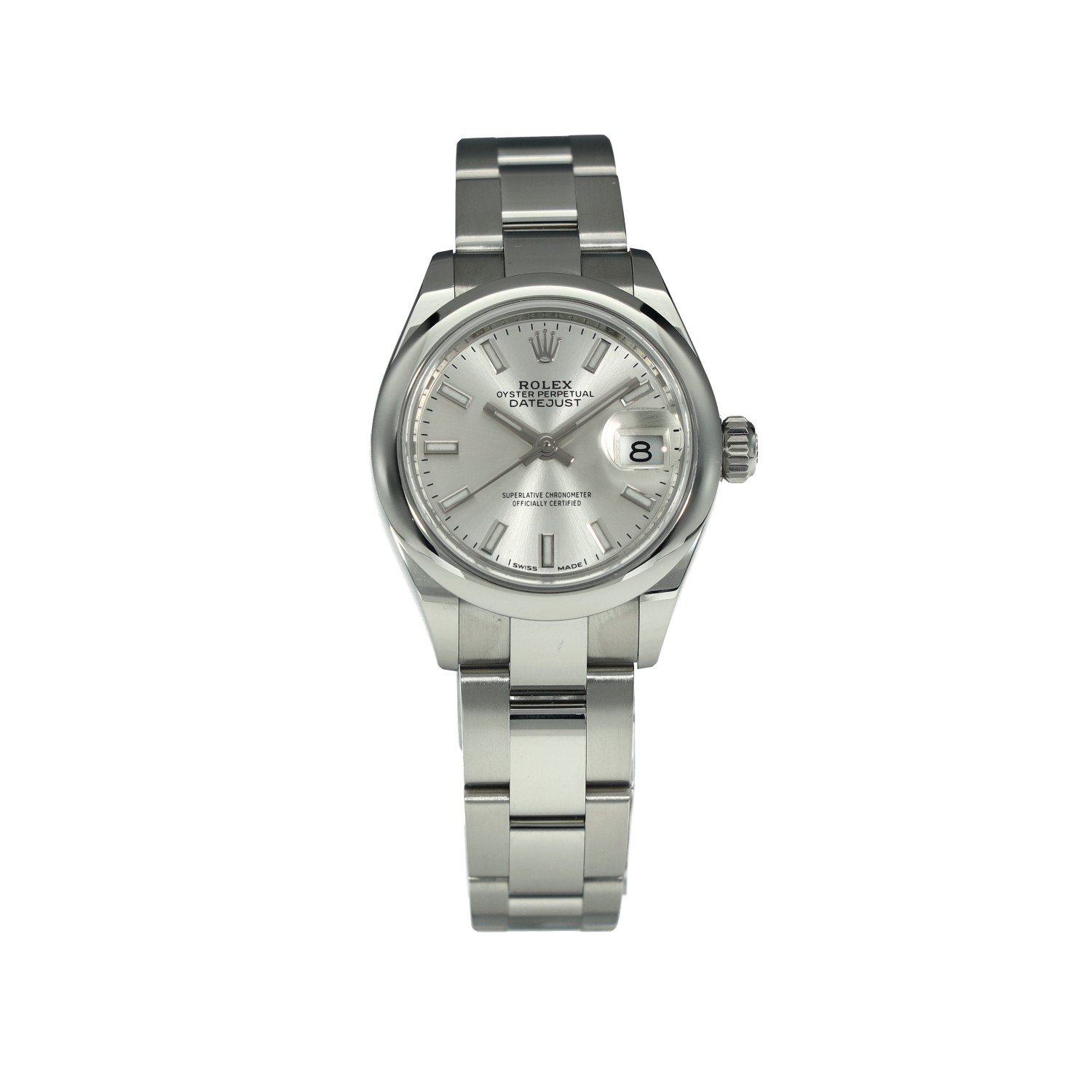 This Rolex Datejust Lady 28 279160 has a silver baton dial and a bracelet strap. This Rolex has undergone a thorough inspection of water resistance, accuracy, functionality and condition to determine the level of reconditioning required to meet our strict standards. It has also been referenced against technical documents and manufacturer records where available to ensure authenticity and a clean history. All our watches have a 24-month warranty for your peace of mind. One of our skilled polishing technicians has removed marks on the case and bracelet of this watch, brought about by daily wear and tear, which is why this watch does not come with the remaining manufacturer’s warranty.