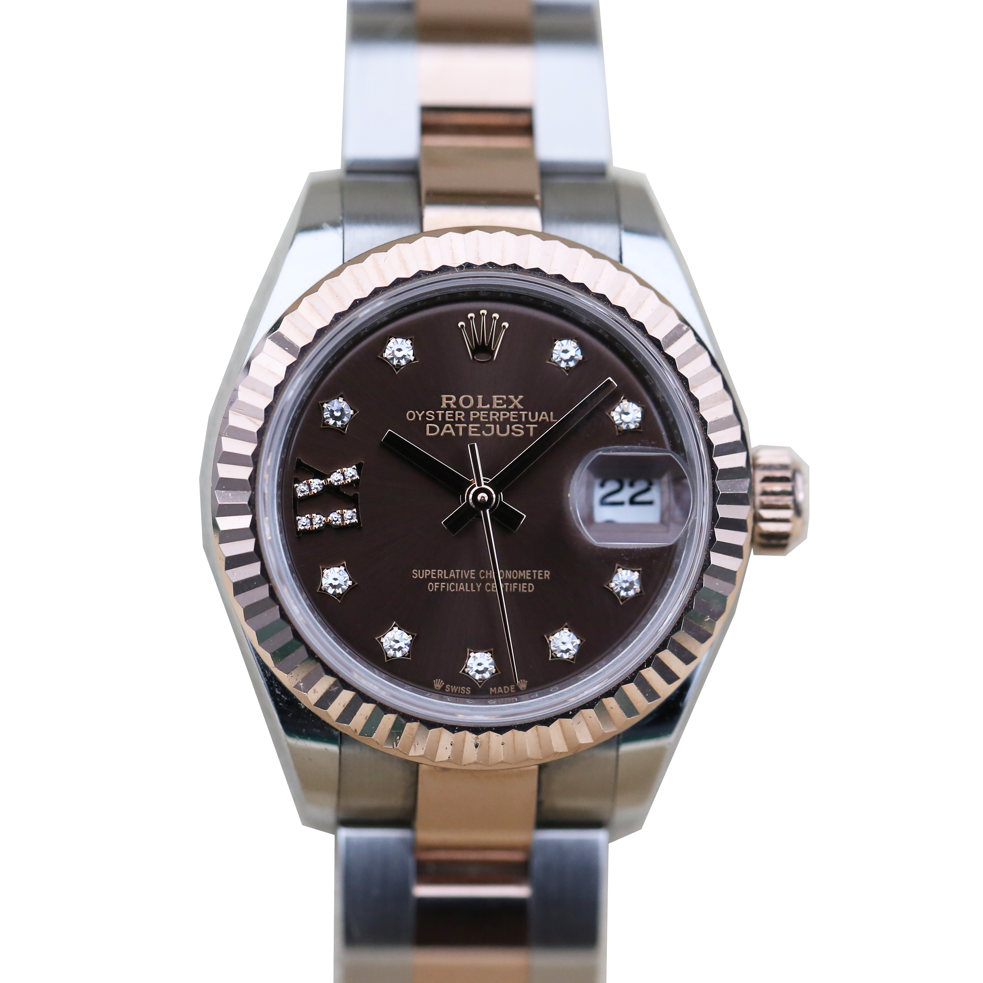 This Rolex Datejust Lady 28 279171 has a chocolate diamond dial and a bracelet strap. This Rolex has undergone a thorough inspection of water resistance, accuracy, functionality and condition to determine the level of reconditioning required to meet our strict standards. It has also been referenced against technical documents and manufacturer records where available to ensure authenticity and a clean history. Our watches have a 24-month warranty for your peace of mind, in conjunction with any remaining manufacturer’s warranty from new or from service. To maintain the manufacturer’s warranty on this watch, it has not been polished in our service centre.