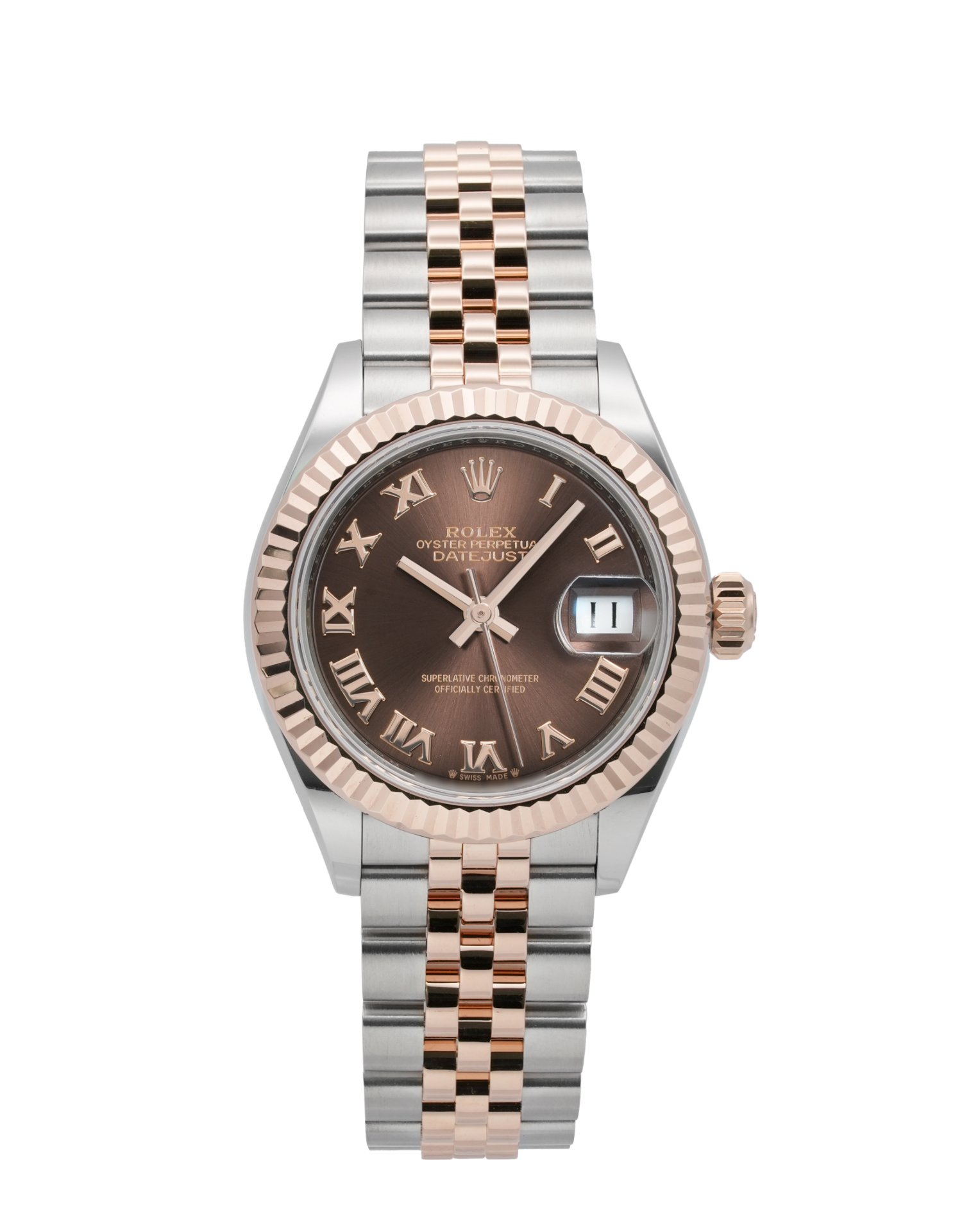 This Rolex Datejust Lady 28 279171 has a chocolate roman numeral dial and a bracelet strap. This Rolex has undergone a thorough inspection of water resistance, accuracy, functionality and condition to determine the level of reconditioning required to meet our strict standards. It has also been referenced against technical documents and manufacturer records where available to ensure authenticity and a clean history. All our watches have a 24-month warranty for your peace of mind. One of our skilled polishing technicians has removed marks on the case and bracelet of this watch, brought about by daily wear and tear, which is why this watch does not come with the remaining manufacturer’s warranty.