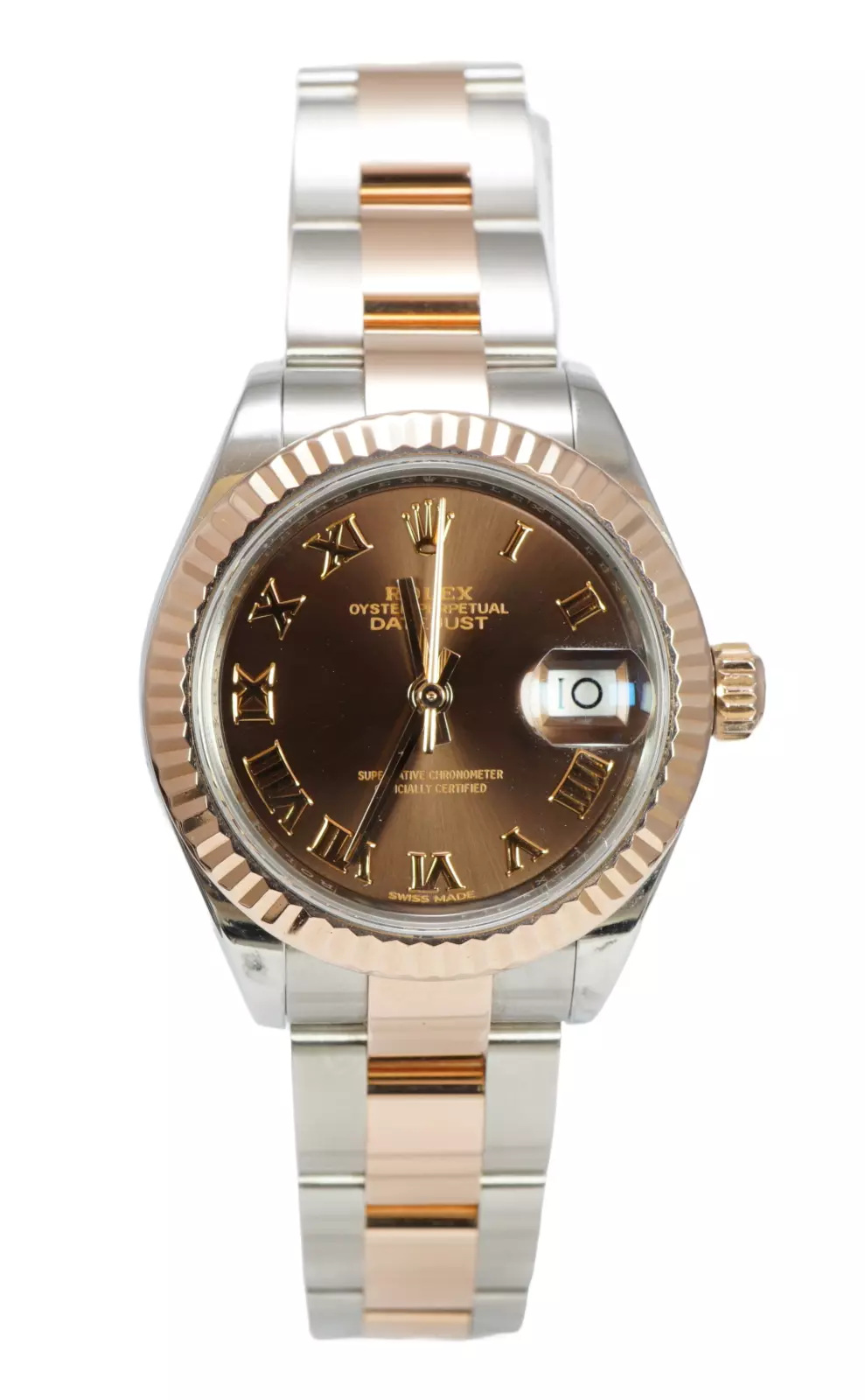 This Rolex Datejust Lady 28 279171 has a chocolate roman numeral dial and a bracelet strap. This Rolex has undergone a thorough inspection of water resistance, accuracy, functionality and condition to determine the level of reconditioning required to meet our strict standards. It has also been referenced against technical documents and manufacturer records where available to ensure authenticity and a clean history. All our watches have a 24-month warranty for your peace of mind. One of our skilled polishing technicians has removed marks on the case and bracelet of this watch, brought about by daily wear and tear, which is why this watch does not come with the remaining manufacturer’s warranty.