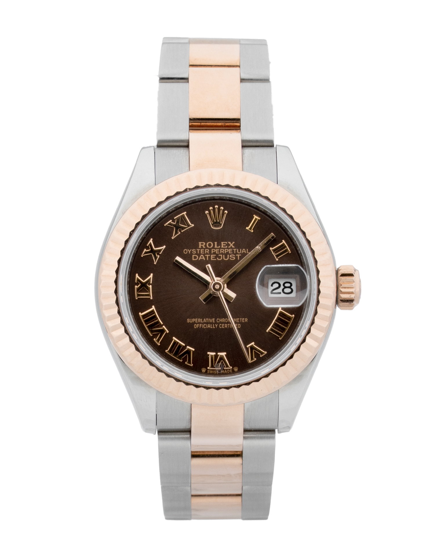 This Rolex Datejust Lady 28 279171 has a chocolate roman numeral dial and a bracelet strap. This Rolex has undergone a thorough inspection of water resistance, accuracy, functionality and condition to determine the level of reconditioning required to meet our strict standards. It has also been referenced against technical documents and manufacturer records where available to ensure authenticity and a clean history. All our watches have a 24-month warranty for your peace of mind. One of our skilled polishing technicians has removed marks on the case and bracelet of this watch, brought about by daily wear and tear, which is why this watch does not come with the remaining manufacturer’s warranty.