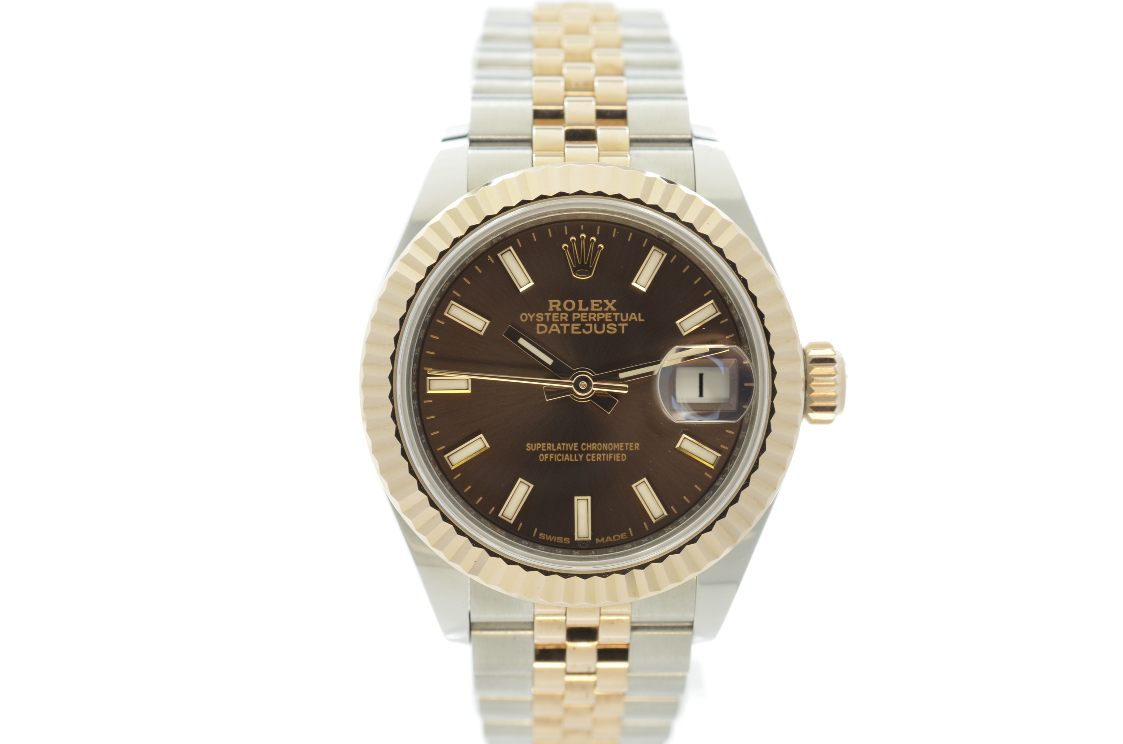 This Rolex Datejust Lady 28 279171 has a chocolate baton dial and a bracelet strap. This Rolex has undergone a thorough inspection of water resistance, accuracy, functionality and condition to determine the level of reconditioning required to meet our strict standards. It has also been referenced against technical documents and manufacturer records where available to ensure authenticity and a clean history. All our watches have a 24-month warranty for your peace of mind. One of our skilled polishing technicians has removed marks on the case and bracelet of this watch, brought about by daily wear and tear, which is why this watch does not come with the remaining manufacturer’s warranty.