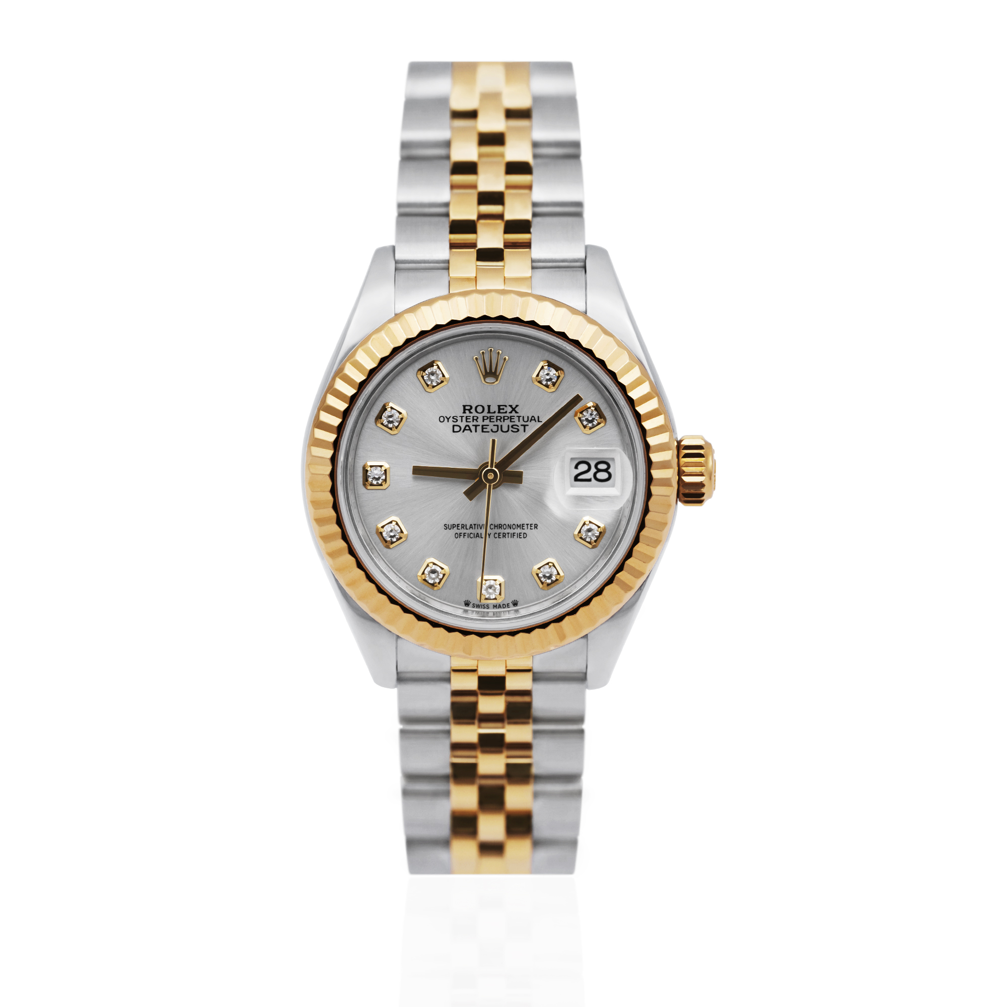 This Rolex Datejust Lady 28 279173 has a silver diamond dial and a bracelet strap. This Rolex has undergone a thorough inspection of water resistance, accuracy, functionality and condition to determine the level of reconditioning required to meet our strict standards. It has also been referenced against technical documents and manufacturer records where available to ensure authenticity and a clean history. Our watches have a 24-month warranty for your peace of mind, in conjunction with any remaining manufacturer’s warranty from new or from service. To maintain the manufacturer’s warranty on this watch, it has not been polished in our service centre.